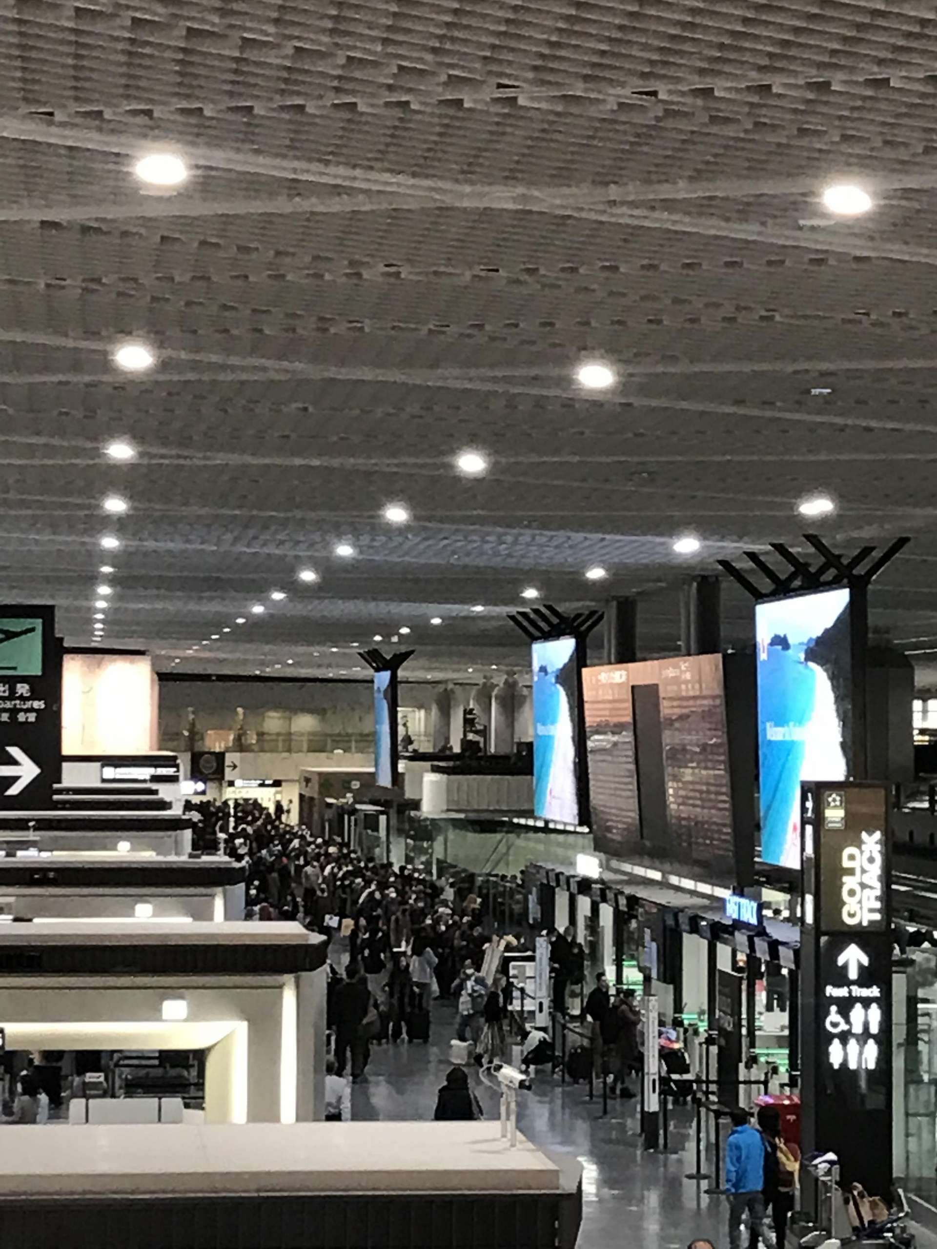 出国審査前に必ず通過する『手荷物検査場』が、ありますが、コロナ禍のピークを過ぎたせいか、この日は、驚く程の長蛇の列。そして並んでいるのは、殆どが外国人の方々。ウインタースポーツを目的に日本に来られた方が多い印象です。