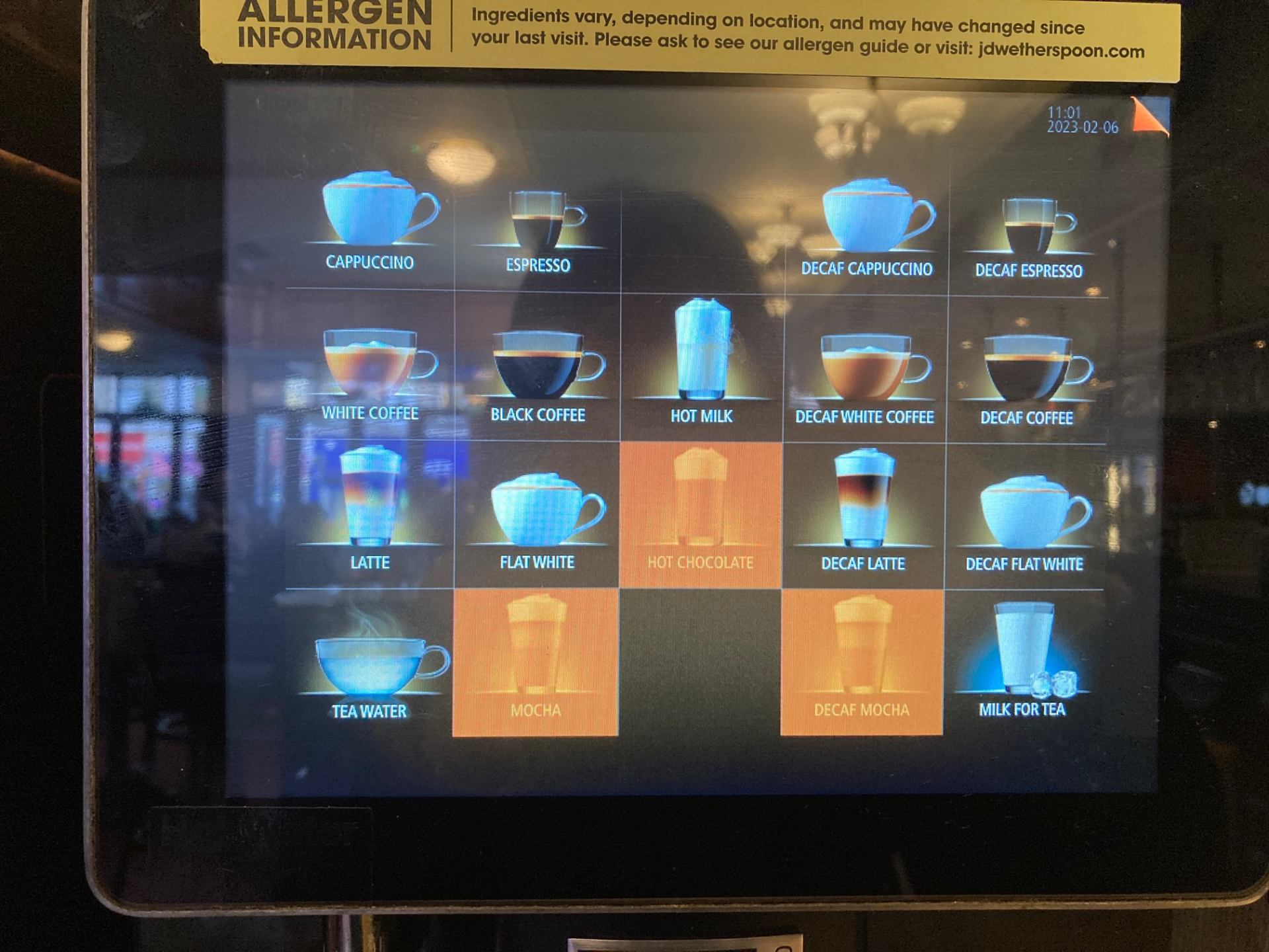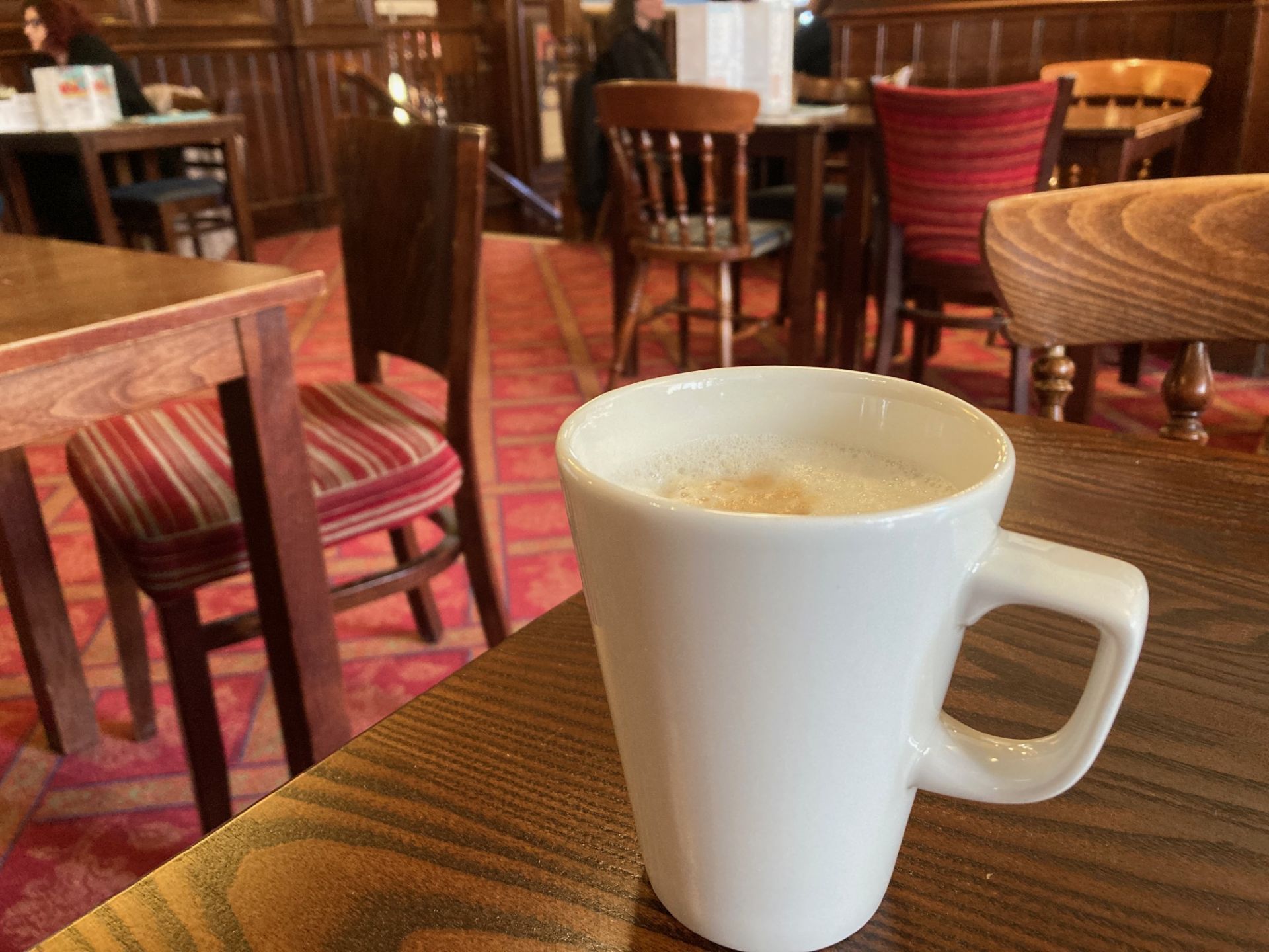 さて、ビールやワインなどのお酒でなくコーヒー&紅茶を飲む場合。ここウェザースプーン系パブでは一律£1.45(2023年2月現在)でボトムレスなんですよ!