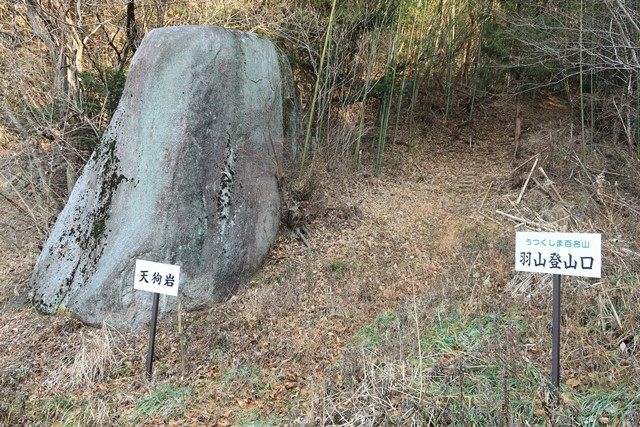 林道とのT字路を左に折れて直ぐの登山口です。天狗岩の右側から山道へと入って行きます。