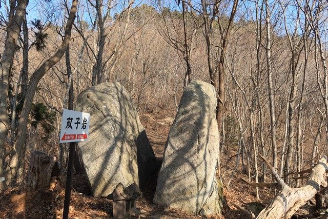 双子岩です。真っ二つに割られたようなカタチで鎮座する大岩で、ルートとはその間を進みます。その先直ぐのポイントに童双神の石祠が建っています。