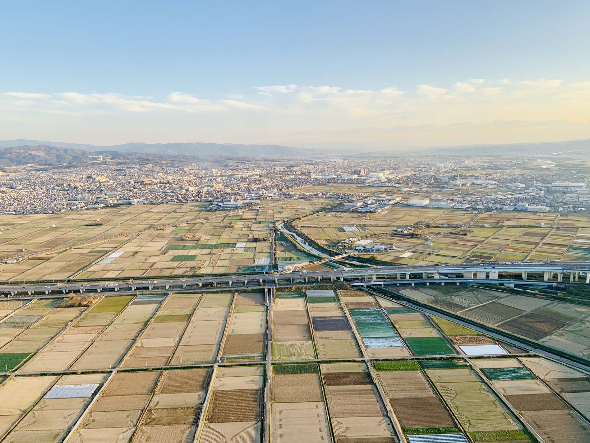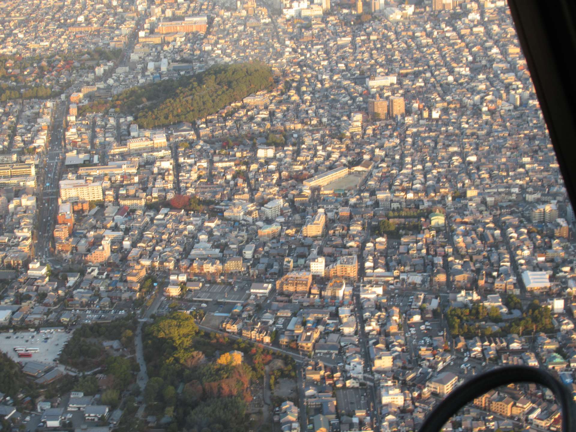 京都市内は建物の高さ制限があり、タワーマンションはありません。上空からは、ジオラマのように民家が続き