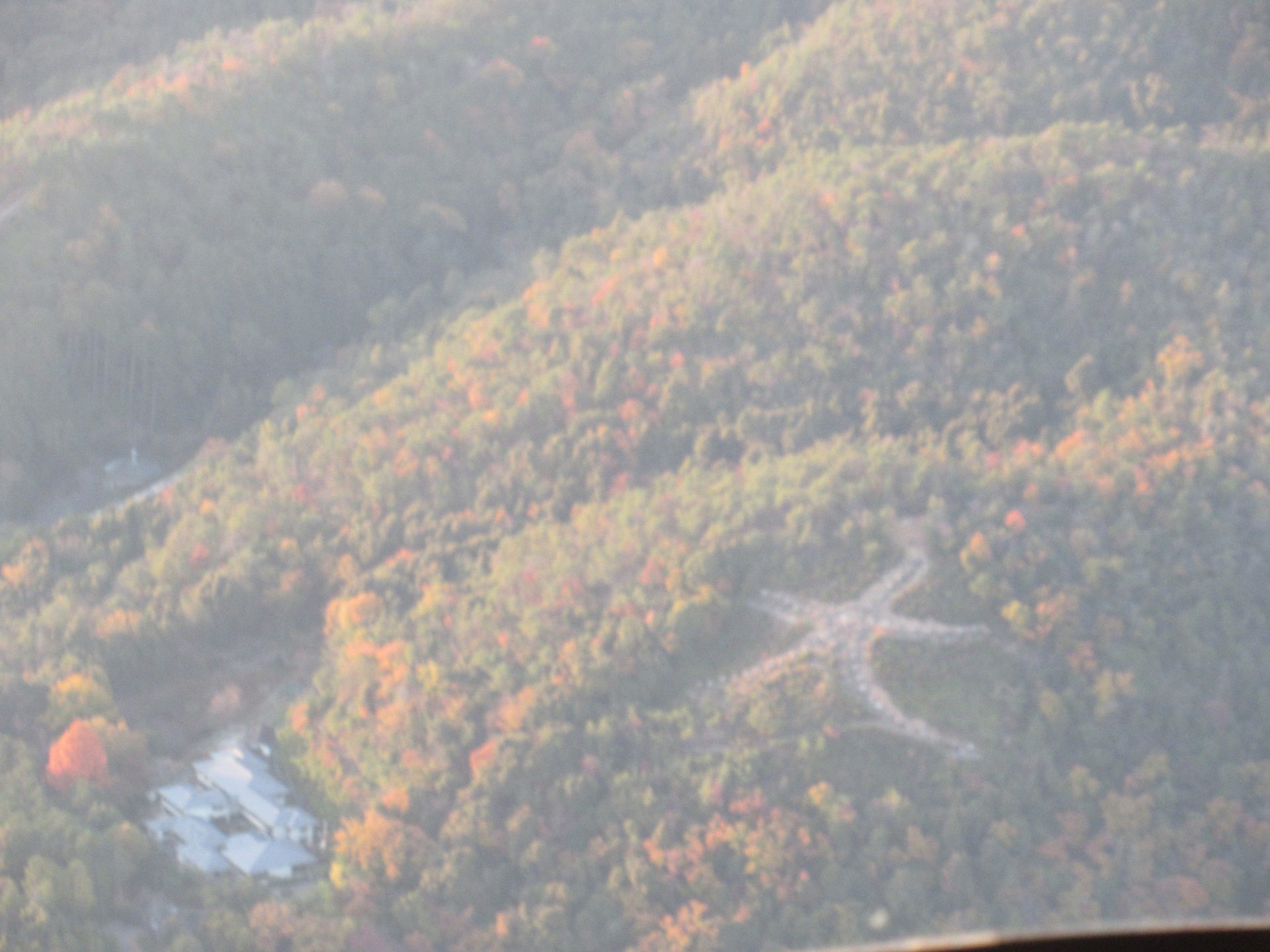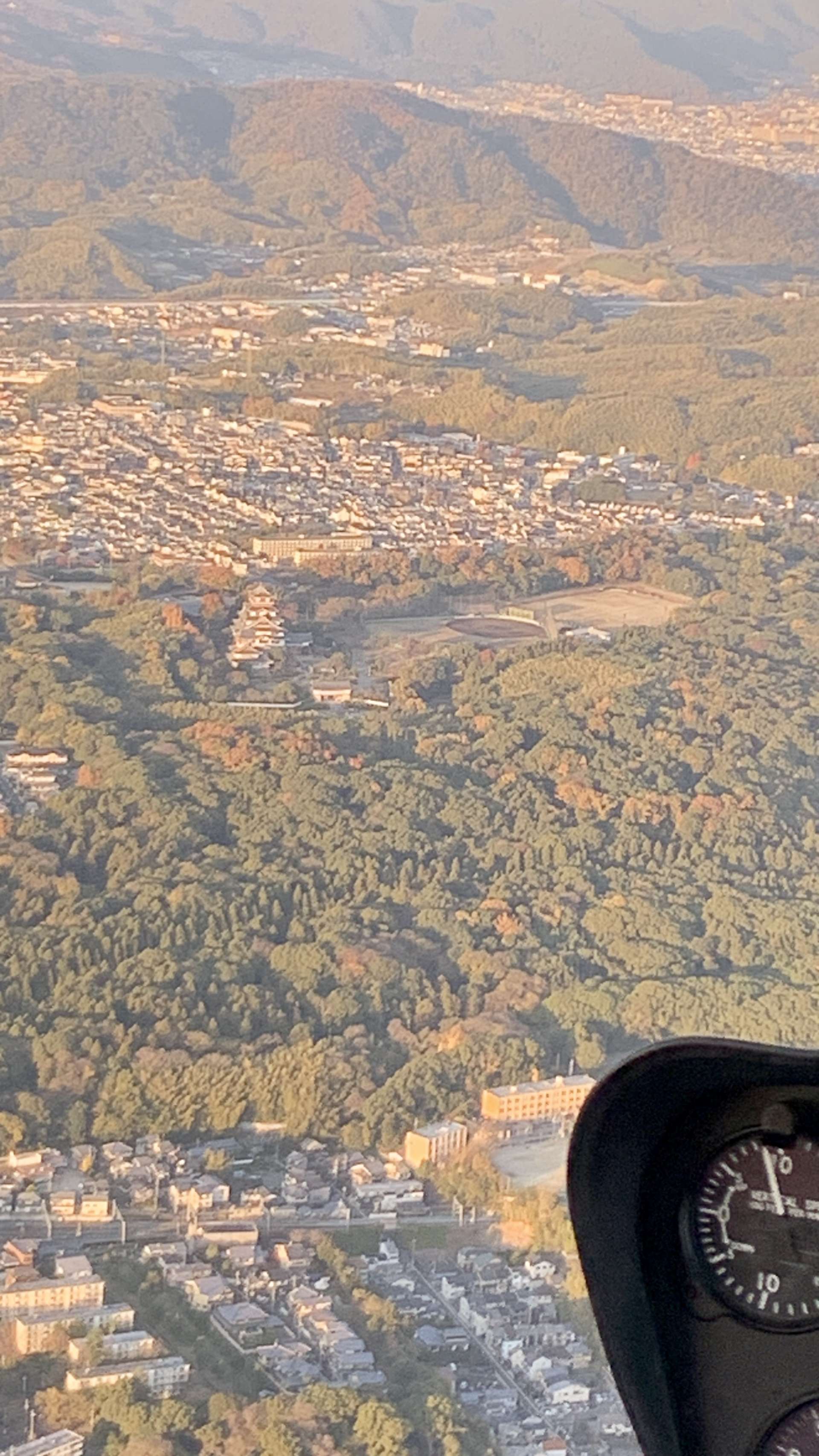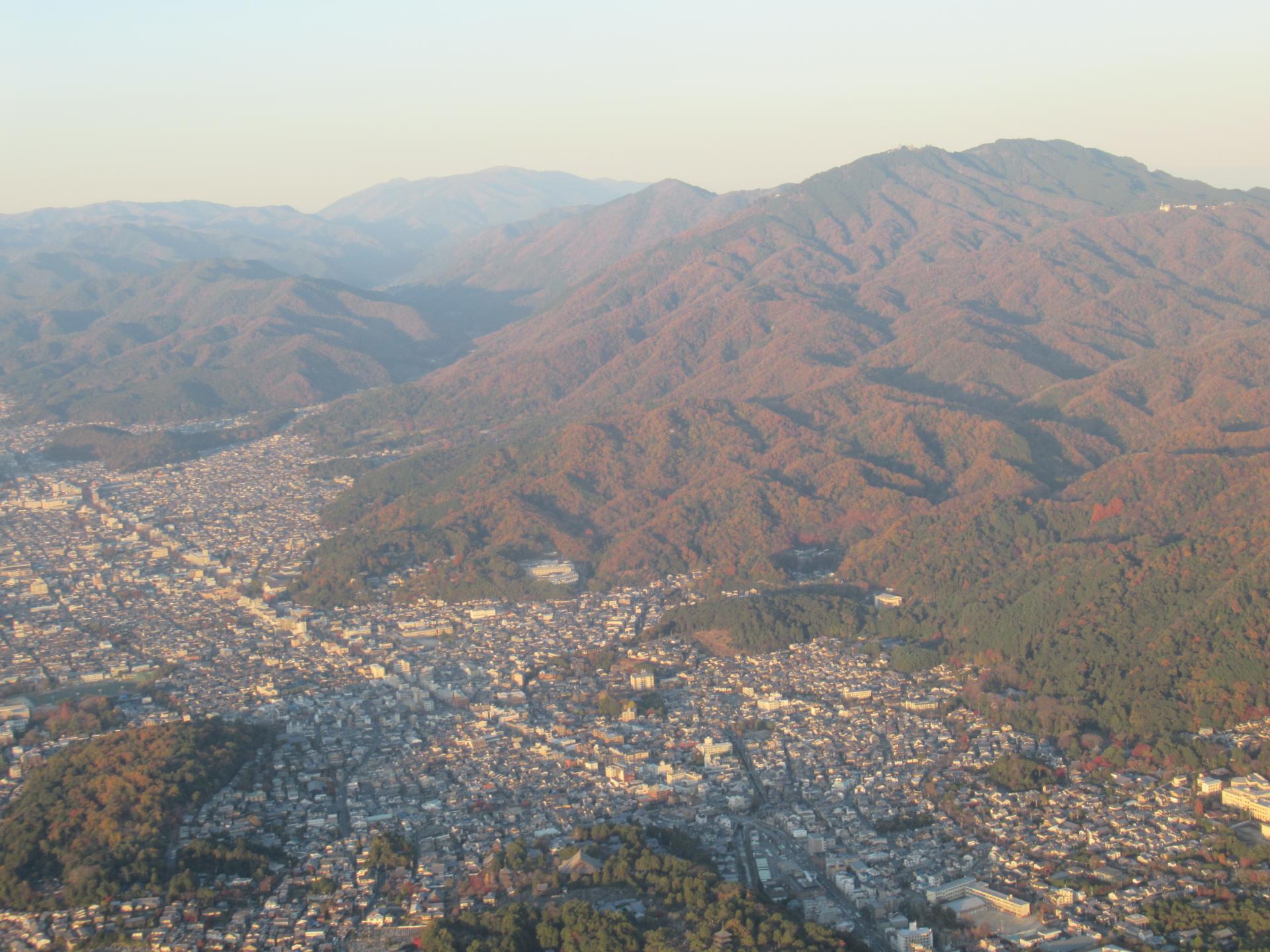 伏見桃山城も眼下に見えます。晩秋~初冬の紅葉の終わりかけの赤茶けた雰囲気が上空から見えます。