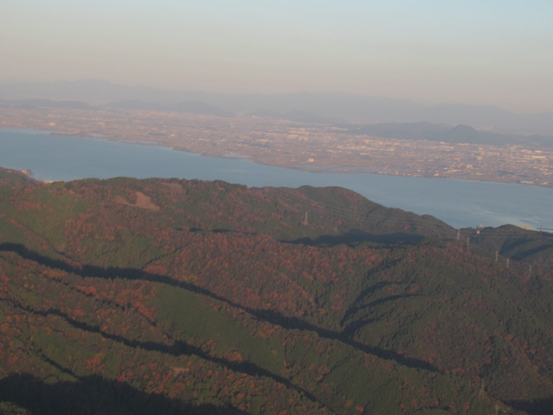 山の向こうには滋賀県で日本一大きな湖・びわ湖が広がっています。列車や車では時間がかかりますが、ヘリコプターならあっという間に見えます。