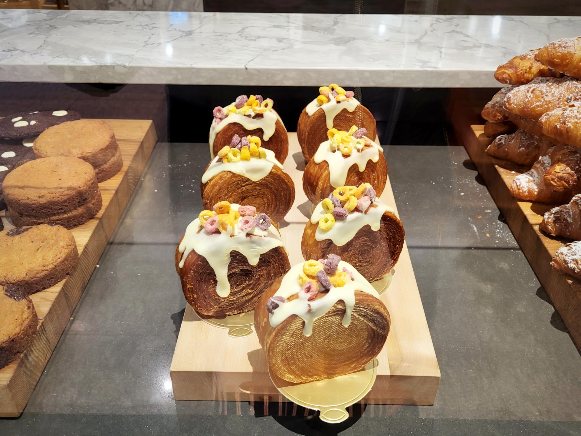 クロワッサンの中にクリームが詰められ、上にはドーナツのようにアイシングされシリアルでデコレーションされています。
