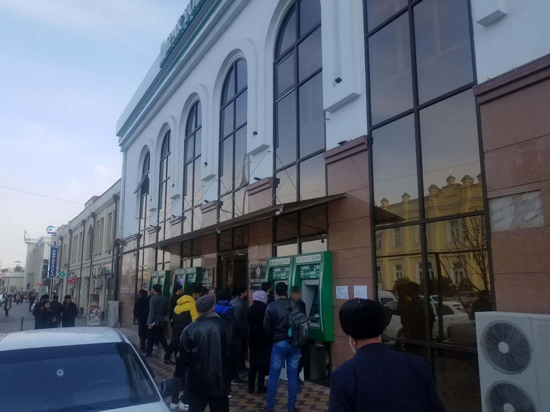 サマルカンドの両替事情は基本的にタシケントと同様で、銀行窓口で米ドルからウズベキスタン・スムへ替えるのが一般的。銀行入口でВы можете обменять?(ヴィー・モージェチェ・アブメニャーチ?:両替できますか?)と聞き、発券機で整理券を発見してもらうか、それが無かったり壊れたりしている場合はКто последний?(クトー・パスリェードニー?)と周りに聞いて列の最後尾を探します。ただタシケントにも言えることですが、だいたいどの銀行でも両替窓口はあるものの、昨今ロシアからの移住者が増えたことも影響しているのか慢性的に混みあっているのです。ただ両替したいだけなのに30分も待ちました、という苦行もザラ。