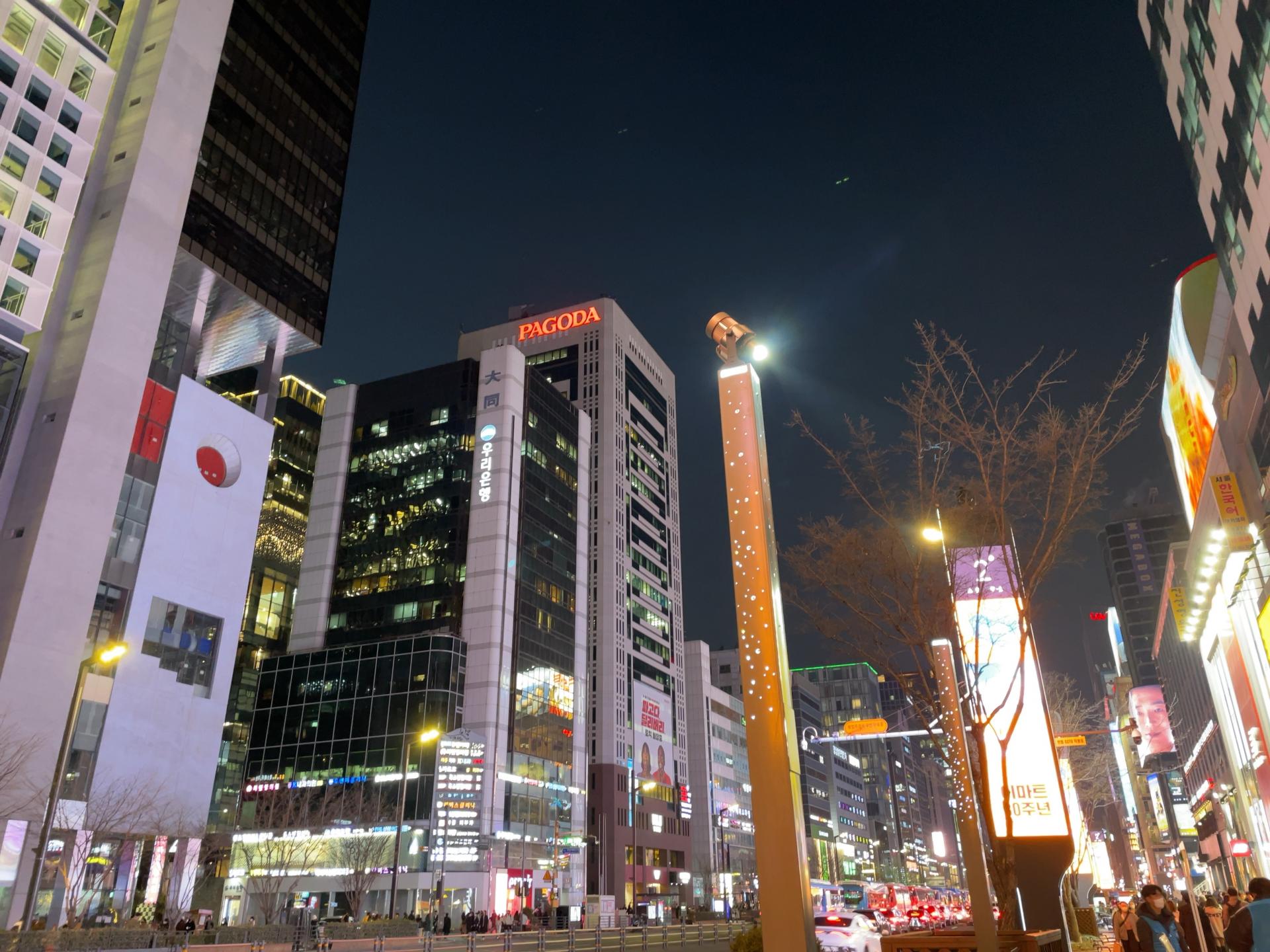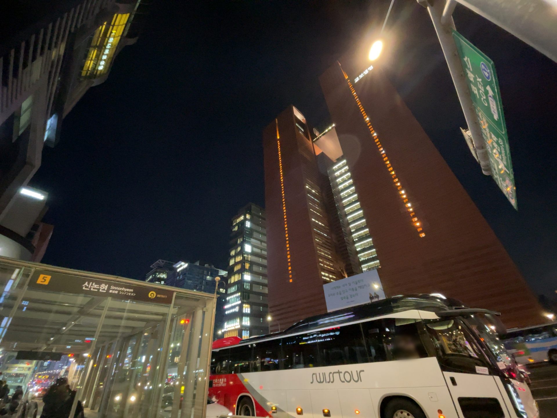 江南駅11番出口から新論峴駅6番出口まで徒歩10分ぐらいで到着。教保タワーが明るく輝いています。大きな道路は江南大路というソウルと京畿道を結ぶ道で、中長距離バスが行ったり来たりしていました。流行の発信地でもある江南駅周辺は歩くだけでも楽しいので、ぜひ訪れてみてください。