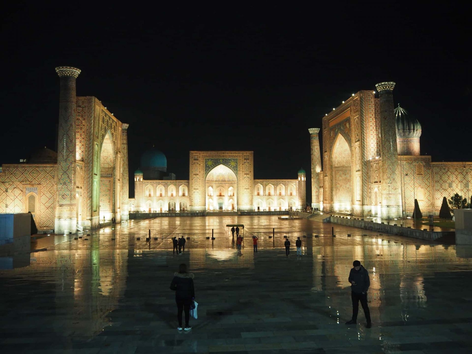 このレギスタン広場は毎晩美しくライトアップされるので、ぜひ夜にも行ってみましょう。また雨で地面が濡れているときにライトアップを見に行くと、地面に映る「逆さレギスタン」が見られたり、オンシーズンにはときどきプロジェクションマッピングをやっていたり…と、日によってさまざまな姿を見せてくれます。