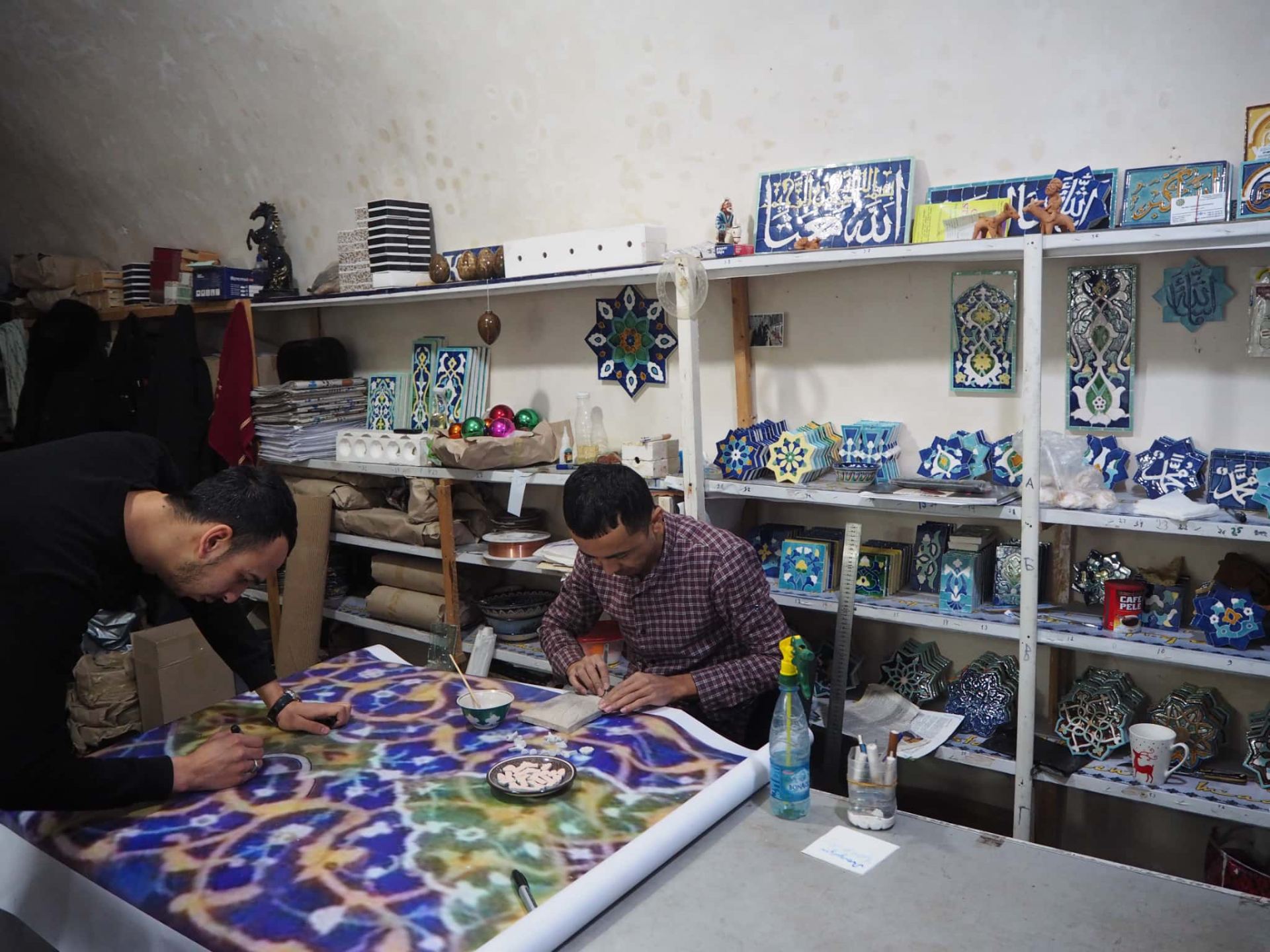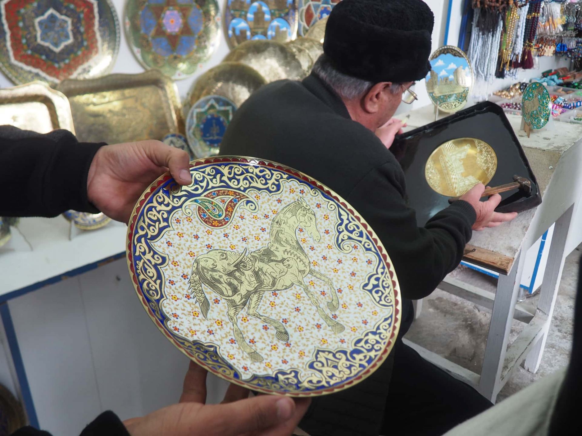 同じようなお土産を売っている土産屋ばかりですが、そんな中でおすすめのお店をご案内しましょう。まずは日本語で「レギスタンタイル工房」と書かれた看板が目を引くタイル屋さん。1階では青の都を訪れた記念にぜひ買いたいブルーのタイルや、ウズベキスタン各地の陶器が売られています。そして2階は工房になっており、実際に職人さんがここでタイルを作っており、希望すれば見学させてくれることも。この職人さんたちはソ連時代からウズベキスタン各地の歴史建築や遺跡の修復に携わってきた敏腕の職人さんたちで、実はご縁あって私は時々ここでタイル作りを習っています。日本人に売れそうな模様や絵柄があったらぜひ教えて欲しいと言われているので、何かアイデアがある方はぜひお知らせください。