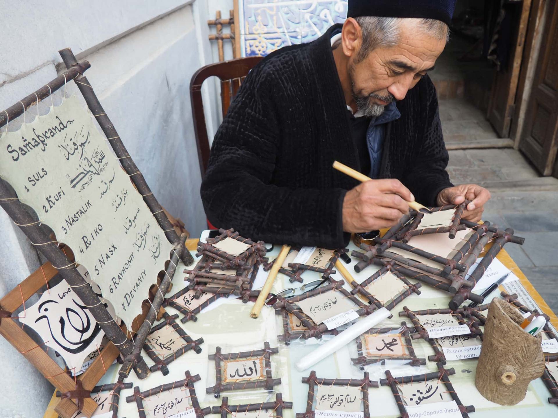 そのすぐ近くにあるのが、レギスタンの名物おじさんオマル氏のカリグラフィー(アラビア書道)のお店。ここでは希望すれば羊皮紙に好きな言葉をその場ですらすらと書いてくれ、その筆さばきは本当に見事なもの。名前を書いてもらって表札代わりに…なんていかがでしょうか。羊皮紙のサイズによって料金が違い、最小サイズで3万スム(2023年3月現在のレートで約360円)。