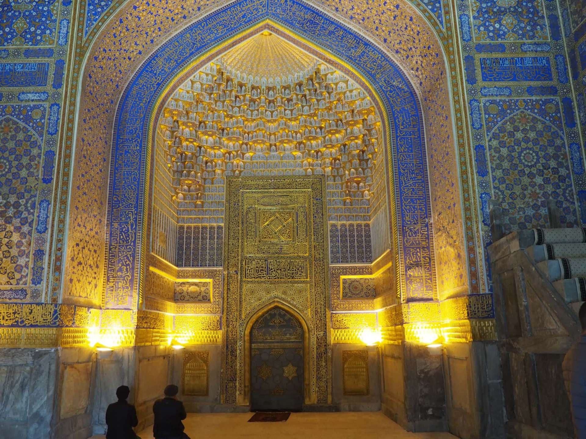 入口から入って左手にある、このドームの下に入ってみましょう。そこにあるのはまばゆいばかりの黄金の間。ここは礼拝所で、ビビハニムモスクが早くから廃墟となってしまったためここがサマルカンドの主なモスクとして使われていました。礼拝スペースには他のモスク同様、メッカの方角を指すミフラーブという窪みや、階段のようなイマーム(礼拝の指導者)用の説教壇ミンバルも見られます。