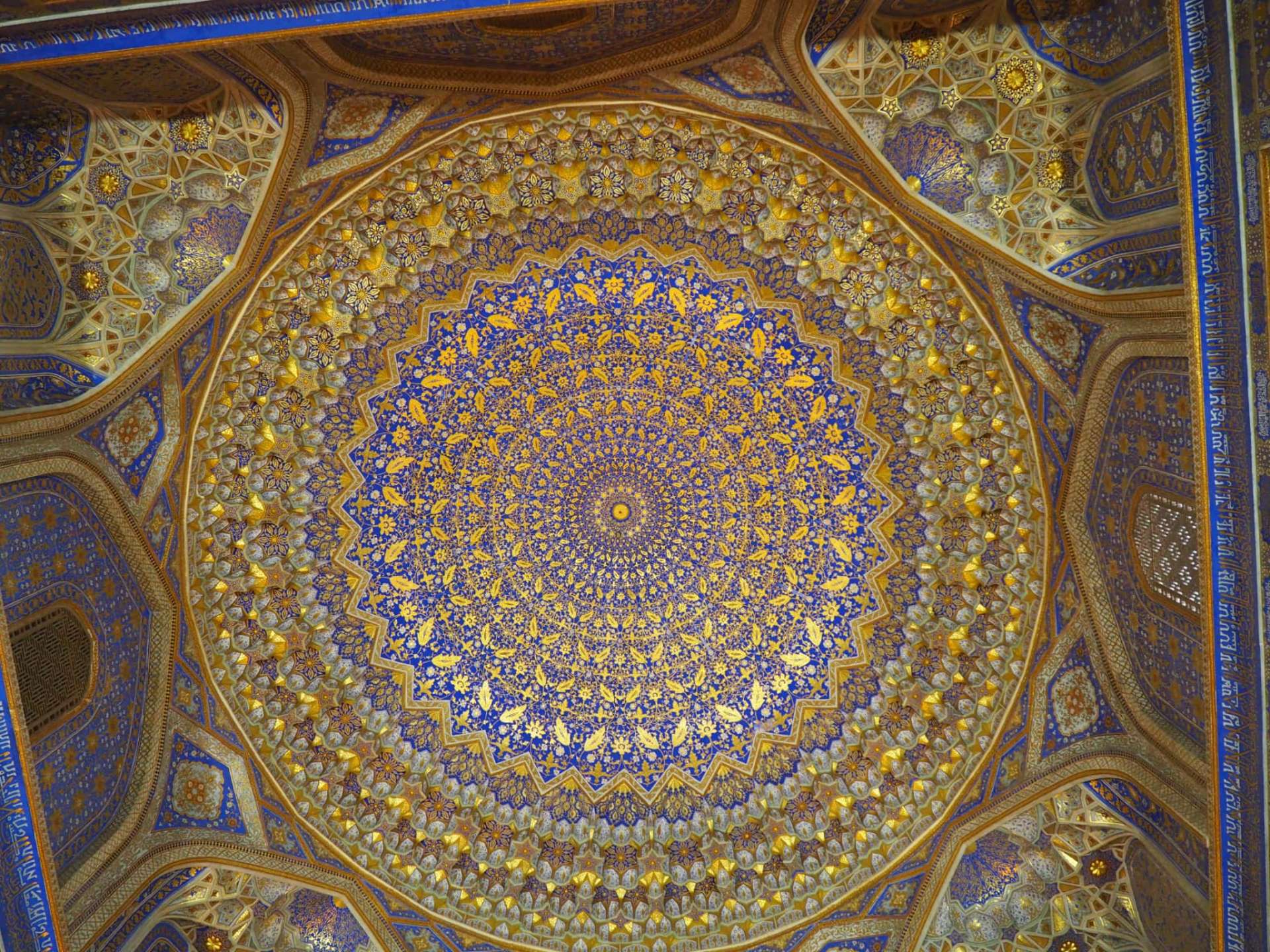 そして天井を見上げると、まるで目が吸い込まれそうなほどきめ細かい青と金色の装飾が!下から見上げるとドームの天井のように見えますが、遠近法を使って描かれており実際は平面だというのだから驚きです。そういえば私が最初にウズベキスタンに行きたい!と思った理由は、偶然この美しい天井の写真を何かの本で見たからでした。