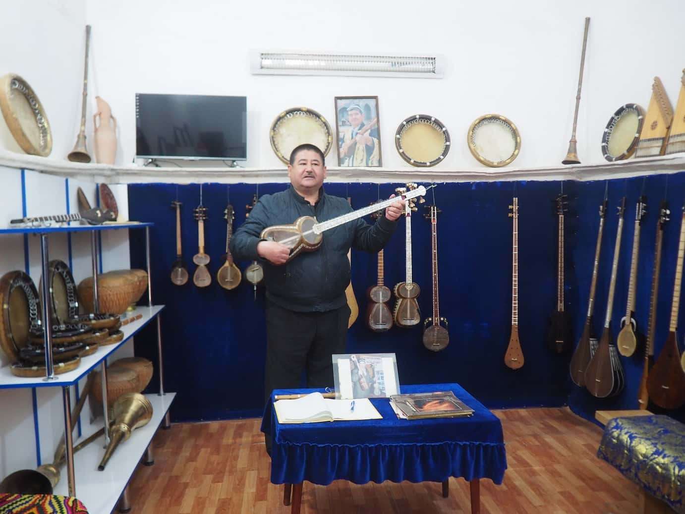 ここにしかないお店が、最奥部アーチのすぐ左にある民族楽器のお店。店主のボーブルさんはあらゆる楽器を演奏できる音楽家で、リクエストするとミニコンサートと称して弦楽器ドゥタールやルボーブ、タンバリンのような打楽器ドイラといった定番の伝統楽器から、珍しい口琴チャンコブズまで演奏して見せてくれます。次々と出てくるウズベキスタン民族楽器の美しい音色は必聴です!聞かせてもらった際はぜひお礼にお心づけを。