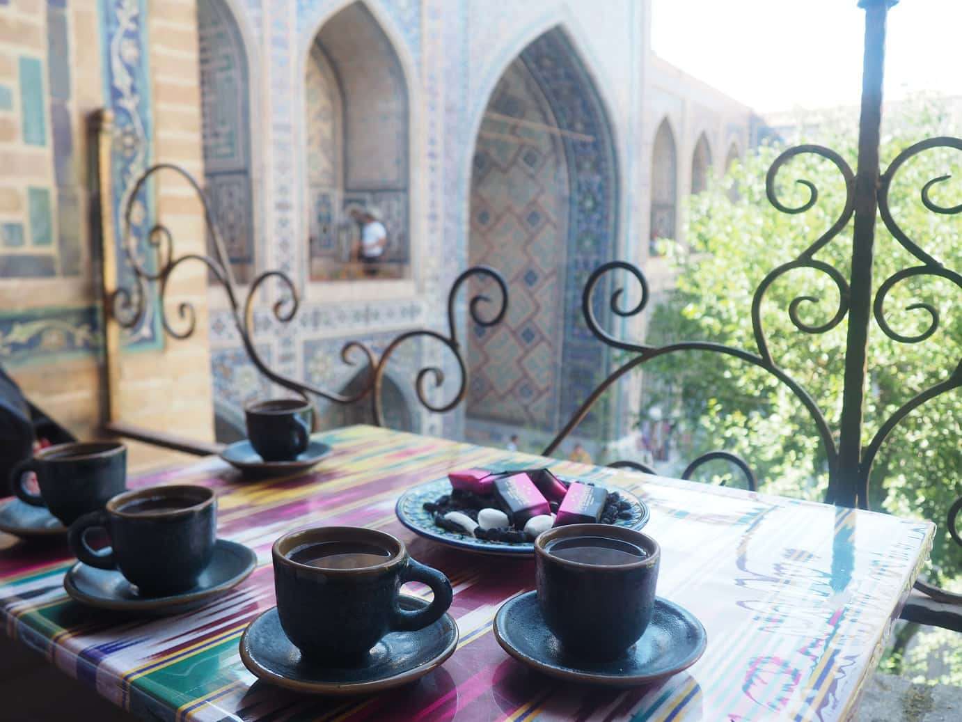 さらにこのお店の隣にはコーヒーの看板を出しているお店があり、階段を上って2階に上がると小さなカフェが出現。市内の一般カフェと比べると少し値は張りますが、中庭を見渡しながらゆったりコーヒーやお茶を飲むことができます。このカフェの反対側、ウルグベク・メドレセの南西の角から上がって2階には、サマルカンドでは珍しいトルココーヒーを出してくれるカフェも。