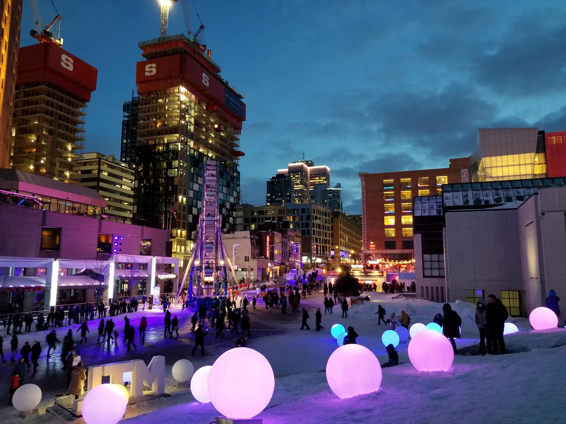 Place des arts(プラス・デザー)で開催される光の祭典フェスティバルは、スケートの小道、観覧車、屋外スケート場、コンサートありの冬の一大イベントでもあります。