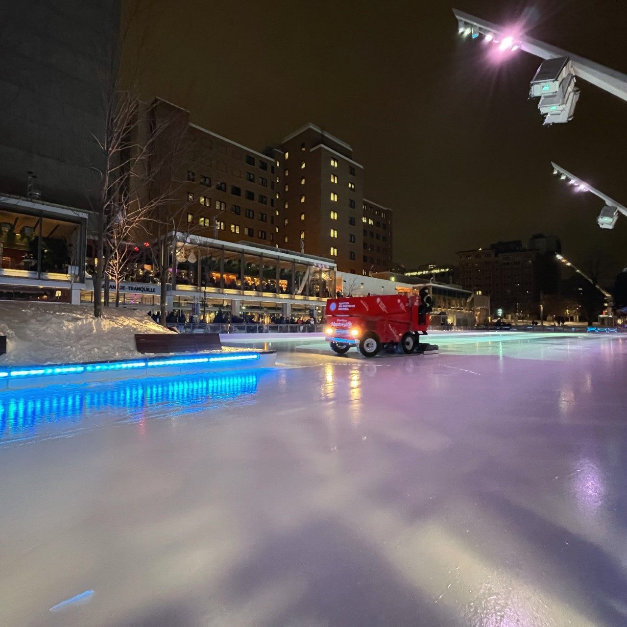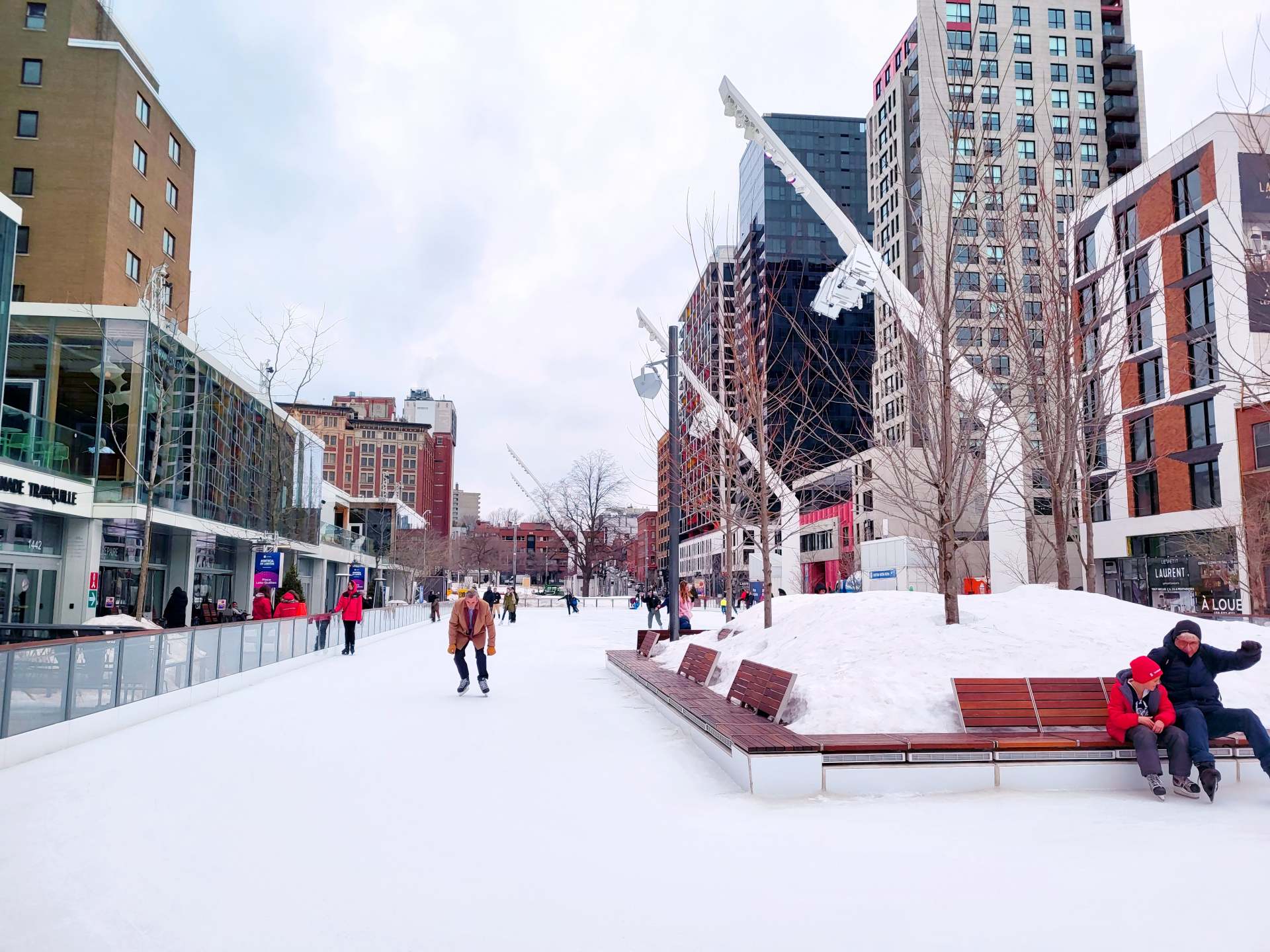 Saint-Laurent(サン・ローラン)通りを越えたところにある、L'esplanade tranquille(エスプラネード・トランキーユ)に設置されたアイススケートリンクでは、朝から夜までスケートを楽しむことも出来ます。