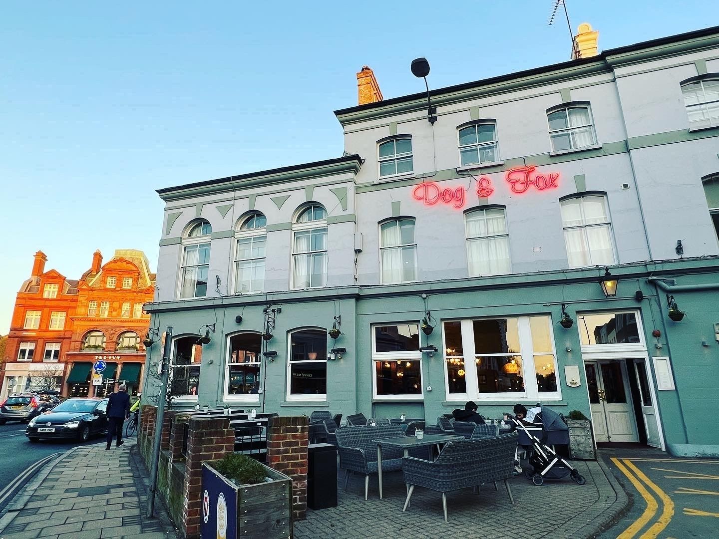 ウィンブルドンには個性的なパブがいくつもありますが、ビレッジの“顔”ともいえるのが「Dog & Fox(ドッグ&フォックス)」です。ビレッジの中心部に位置し、昔ながらのパブらしくホテルも併設しています。