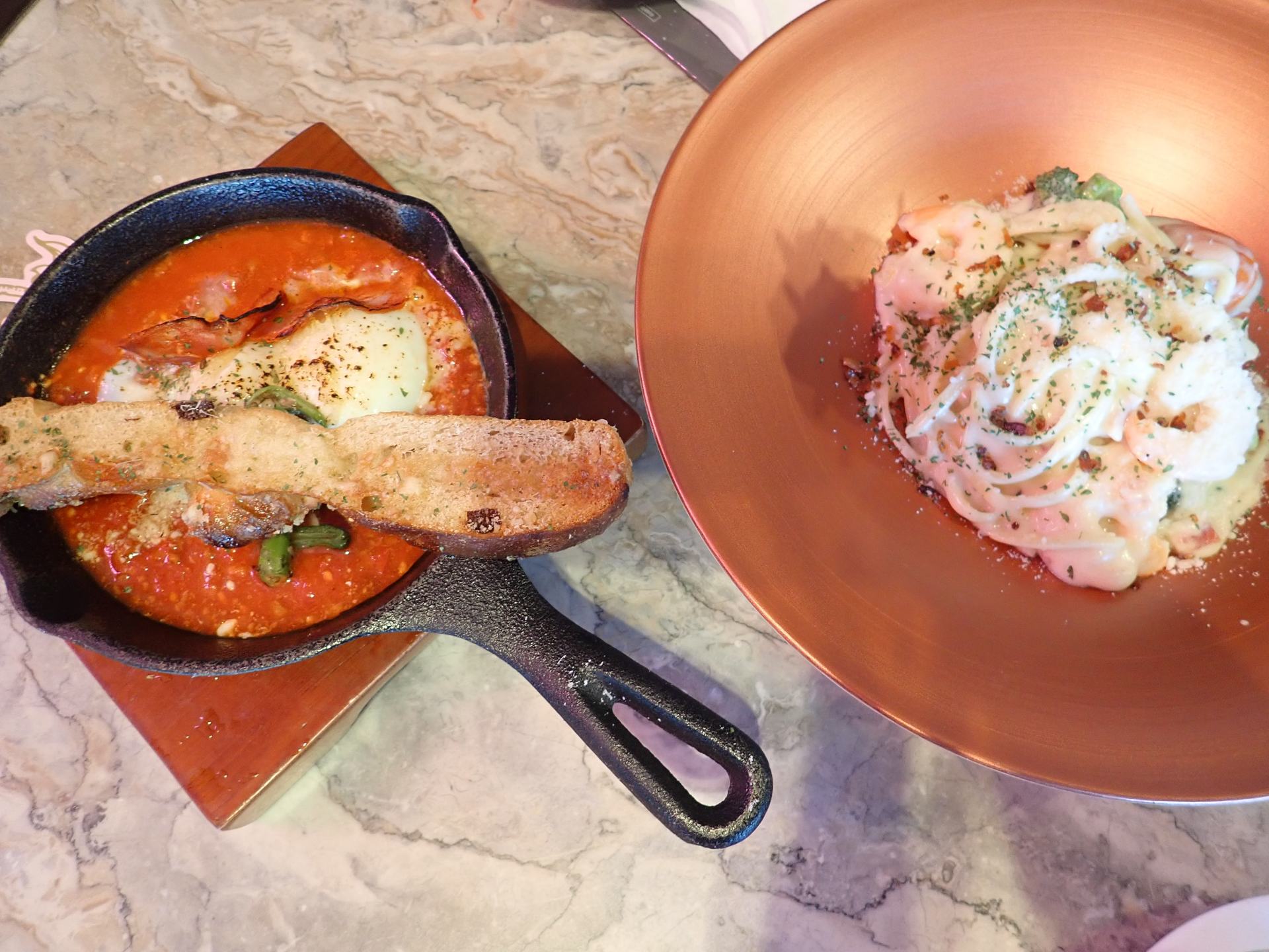 そのあとにメインディッシュのエッグ&ビーフと海老いっぱいクリームパスタが出てきます。デザートを食べ過ぎると、メインディッシュが食べられなくなりますので、ご注意ください。
