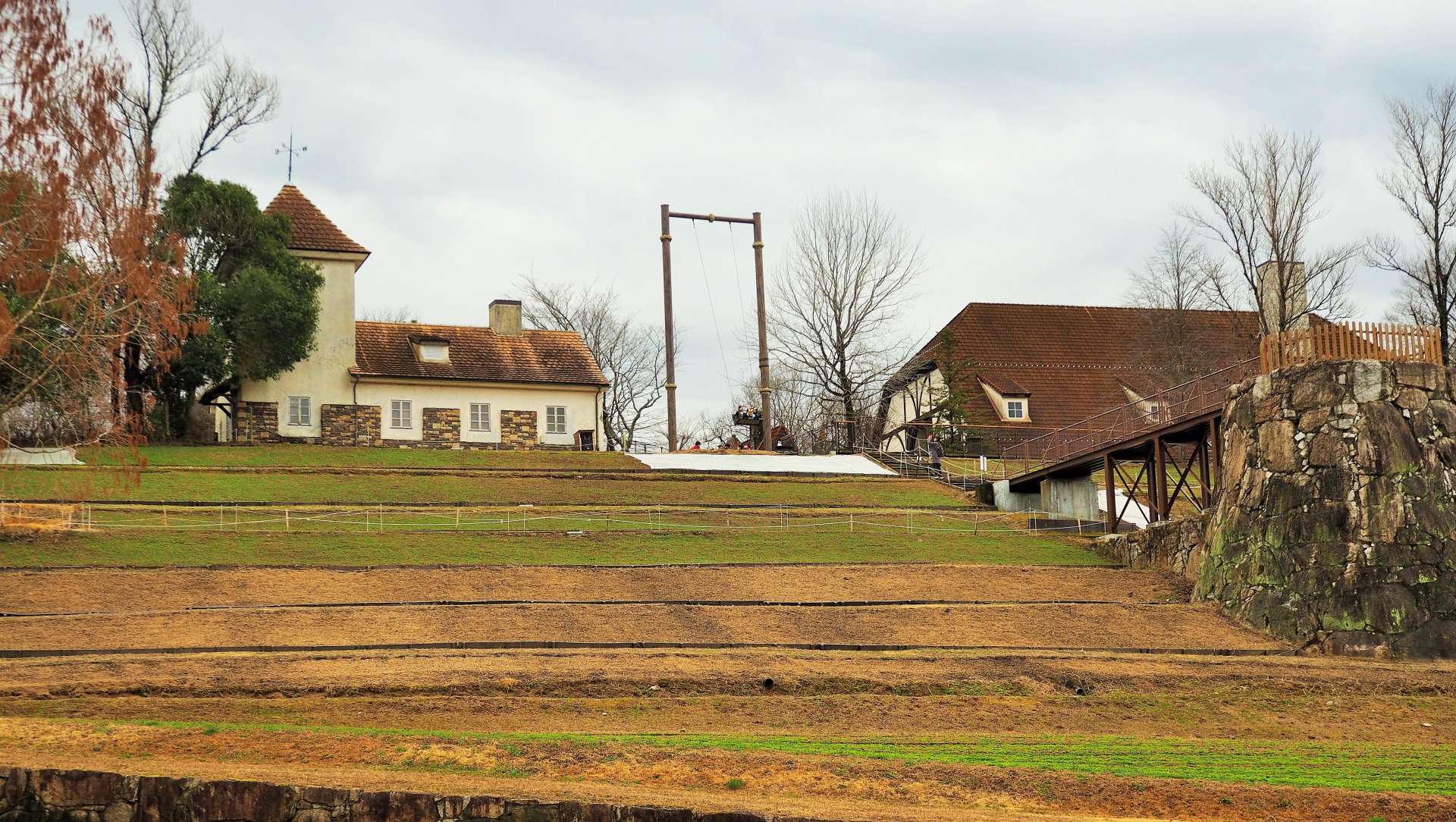 春になって一面がお花畑になったころは素晴らしい眺めだと思います。正面の建物群は「街エリア」です。あちらで食べることにしましょう。