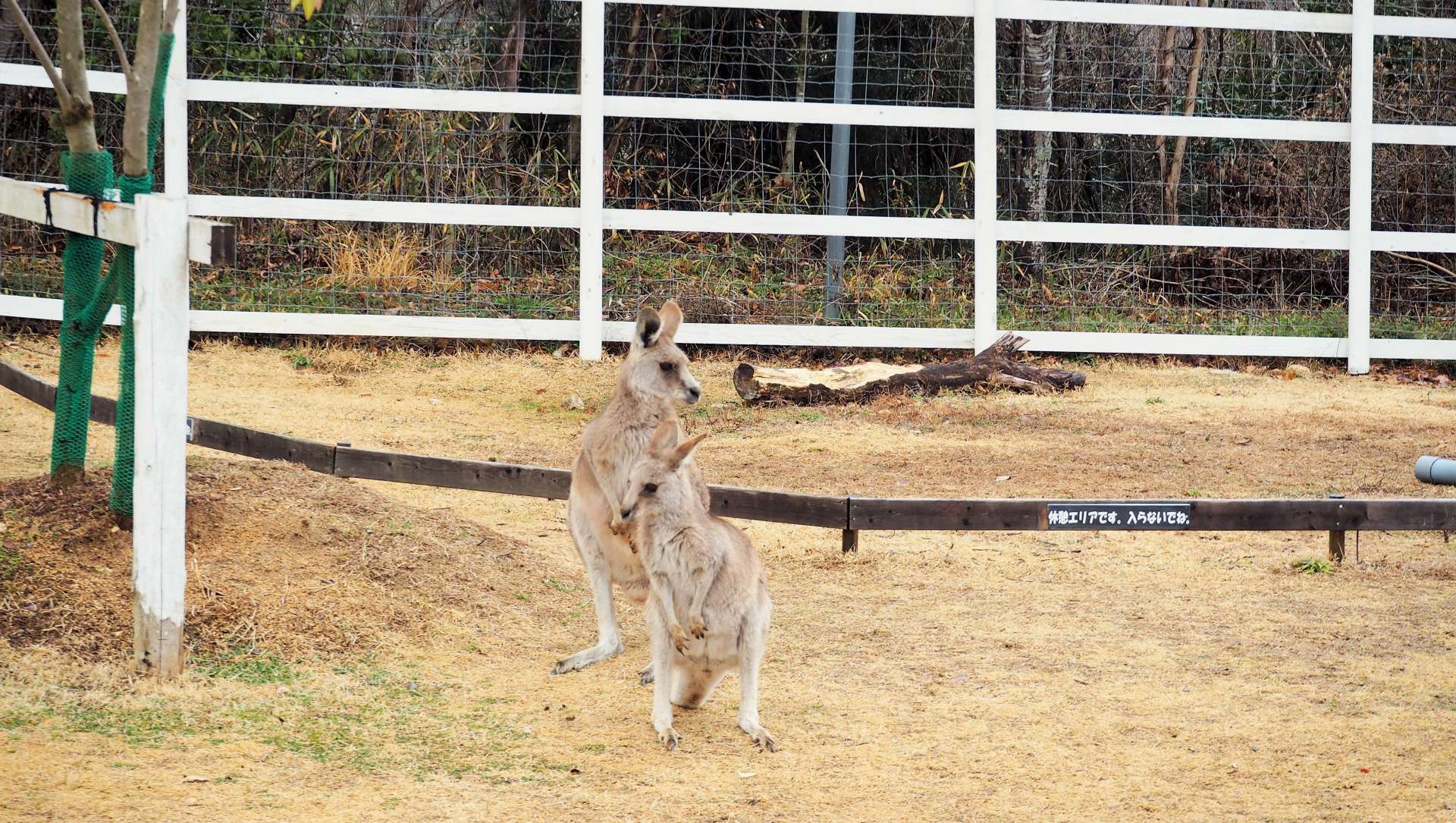 カンガルーやワラビーの小屋には入って触れ合うことが出来ます。ちょっと、怖いので遠巻きにしてパチリです。