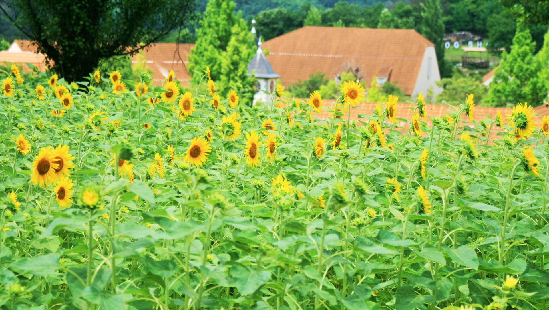 こちらも全てお花畑です。丘の上に見える四角い工作物はブランコです。あの丘の上には石窯で焼いたピザやパンを作る工房があるので、まずは腹ごしらえに向かいます。