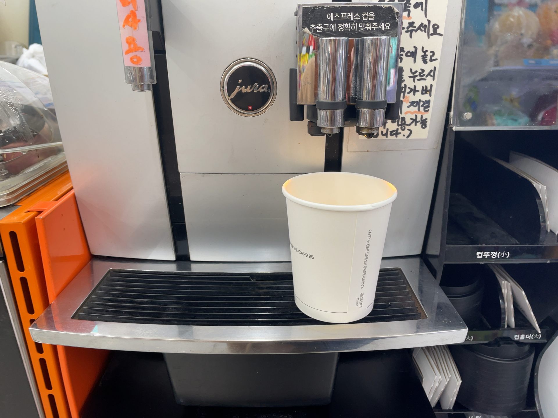 注文方法は簡単。店員さんにメニューを伝えて、支払うのみ。ホットのアメリカーノ1杯の場合は韓国語で「タトゥタンアメリカーノ、ハンジャン ジュセヨ(따뜻한 아메리카노 한잔 주세요)」です。ホットのアメリカーノ1杯の価格は1,200ウォン(日本円で約120円)。カフェやドリンク専門店では2,000ウォン~5,000ウォン(約200円~500円)ぐらいするので、とてもリーズナブルです。他にカフェラテ、カフェモカに氷を入れてアイスにもでき、それでも2,000ウォンちょっとの価格です。注文したら、カップをもらい、レジ近くにあるコーヒーマシンにセットするだけ。その後、お店の人がボタンを押してくれます。押してくれない場合は、自分が注文した商品のボタンを押します。