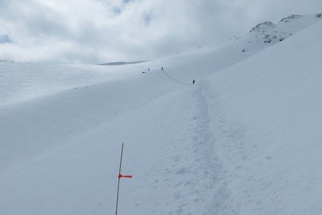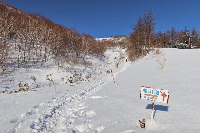 <a href="http://www.adatara-resort.com/ski/" target="_blank">安達太良高原スキー場</a>のゲレンデを横切って登山道へと入ります。