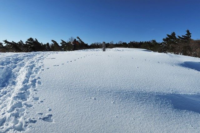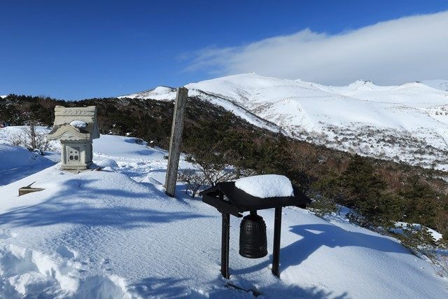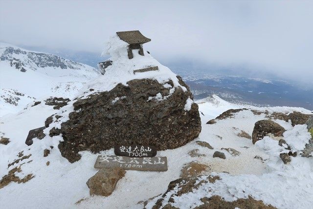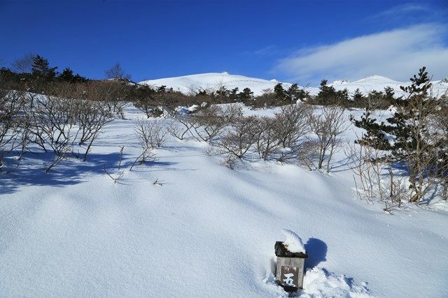 五葉松平より、雪に埋もれた柱票の先に安達太良山のピークを望みます。