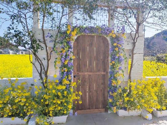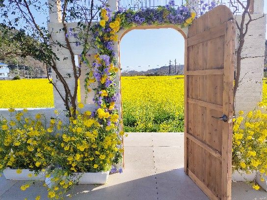 また菜の花畑の中には【オープニング神事】が作られており写真映え間違いなしの花できらびやかに装飾されたドアが作られており訪れた人たちの子供心をくすぐるような仕様になっています!