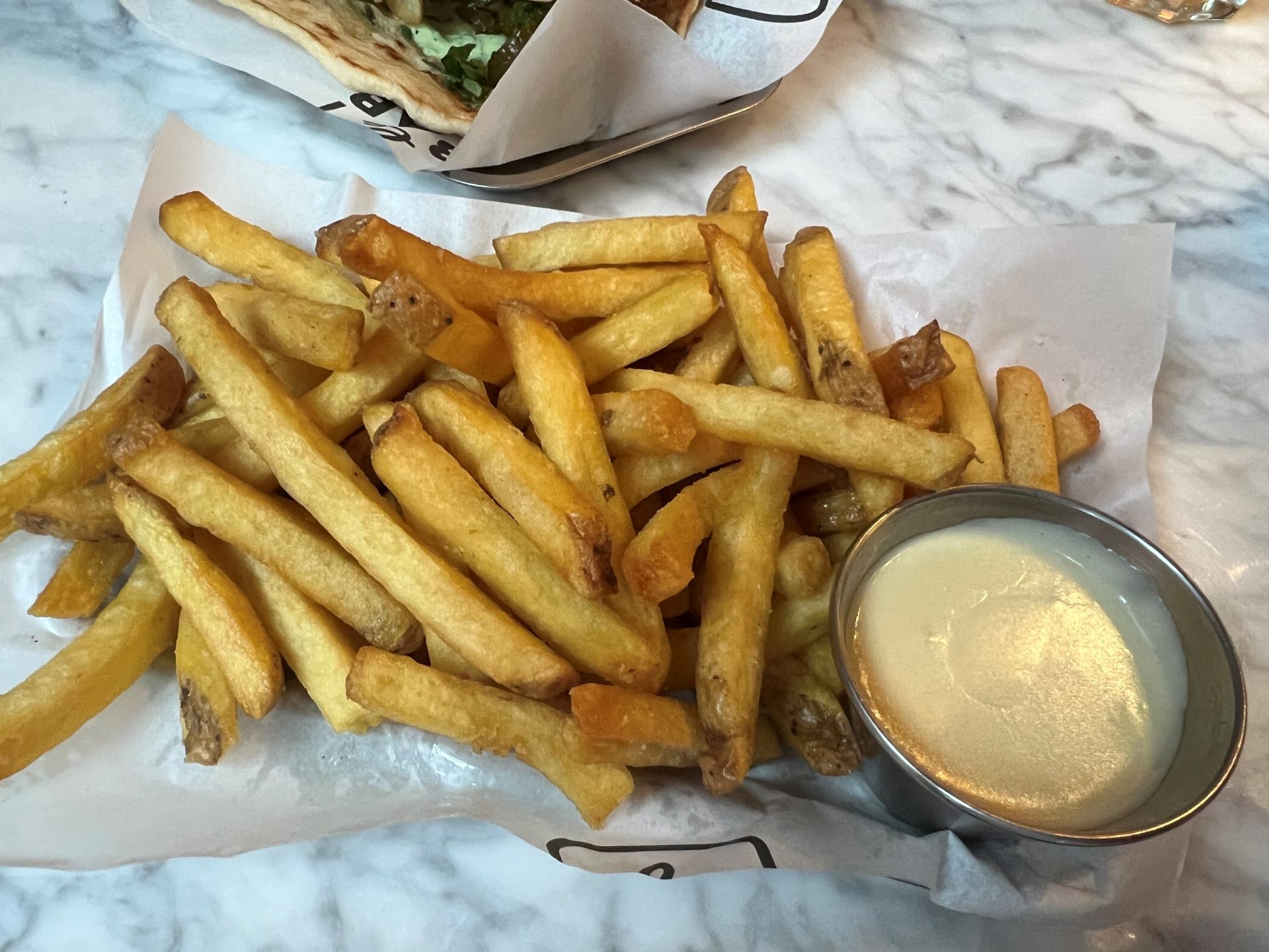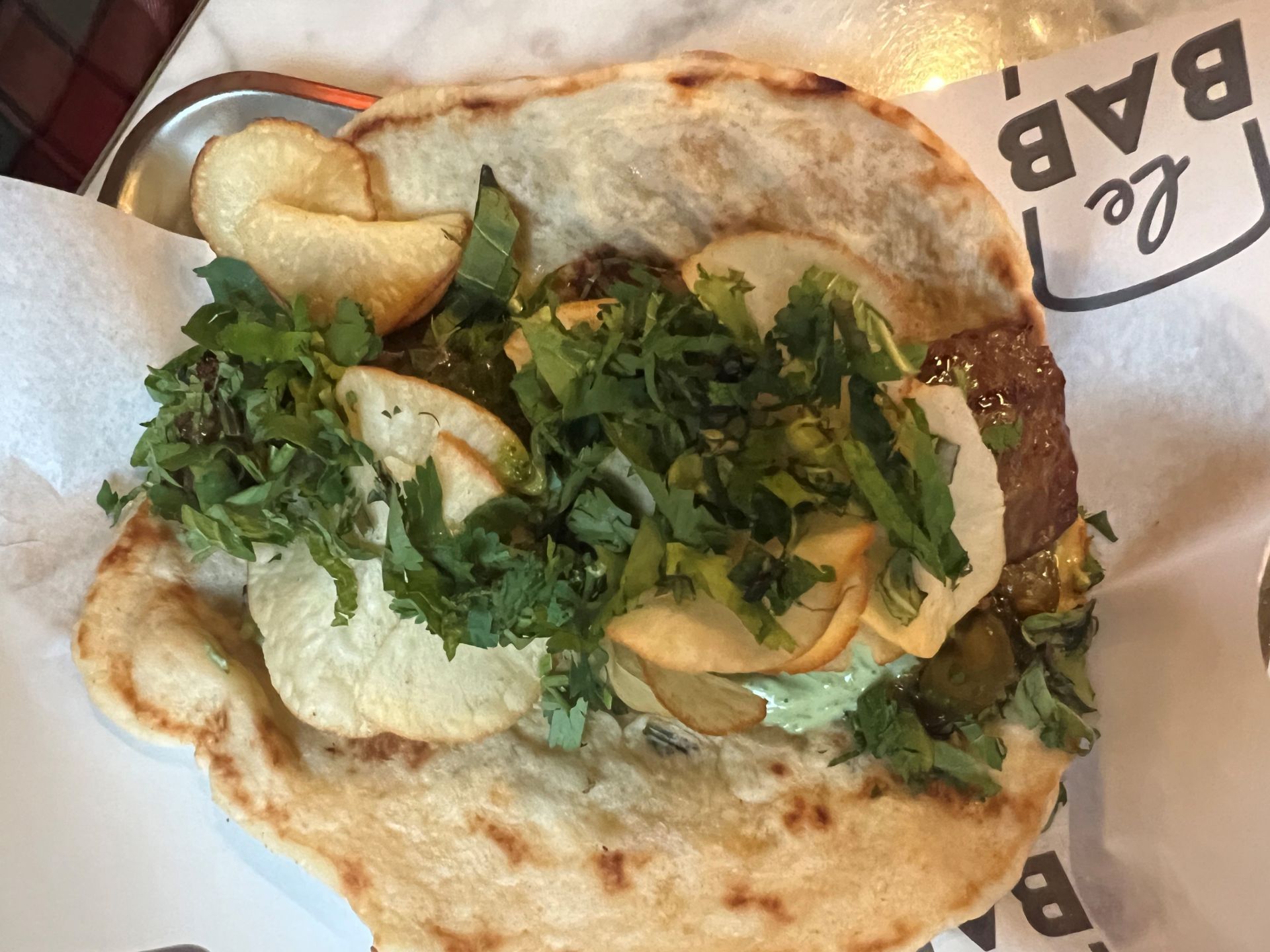 バタシ―発電所には大型チェーン店以外のレストランがまだ少ないです。今後Arcade(アーケード、現在トッテナム・コート・ロードにあるフードホール)なども入る予定のようなので楽しみですが、現在の一押しはこちらの「Le Bab(ル・バブ)」です。ル・バブはロンドン市内に6店舗を構えるおしゃれケバブのお店です。2016年にソーホーでスタートしたル・バブは、ミシュランの星付きレストランで働いていたシェフがケバブを提供する唯一の店として瞬く間に人気店の地位に上りつめました。その特徴は中東伝統の炭火焼調理法を残しつつも世界中の素材を取り入れたフュージョン・スタイルの「全く新しい」ケバブです。最もメジャーなシシカバブは、鶏肉のケバブに、鶏皮のクリスピー揚げ、ハーブヨーグルト、赤キャベツ、きゅうりとセロリのサルサ、コリアンダーとスイートチリ・マヨネーズが入ったものです。中東と南北アメリカ大陸のフュージョンで美味しかったです。前菜ではトルコ・韓国風フライトチキンなんていうインターナショナルな一品も。一方で中東の伝統的なフムス(ひよこ豆のペースト)もあります。ロンドンならではのごちゃまぜ感ですね。