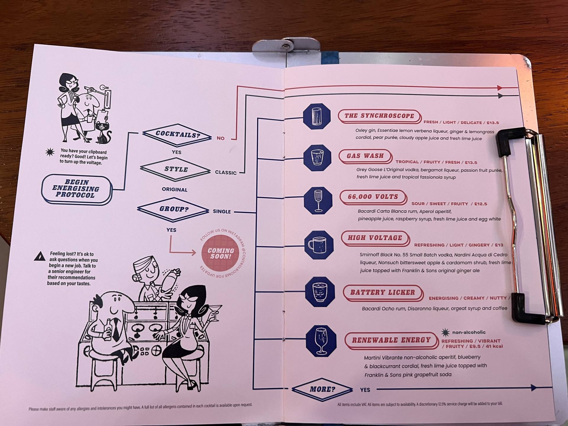 スタッフの方も茶色い作業着スタイルの服を着ているのがチャーミング。メニューもユニークで、スチール製のバインダーに挟まれ、新人エンジニア向けの操作マニュアル風になっています。さらにカクテルのページはプロトコル形式になっており、各項目を「イエス」・「ノー」でたどっていくと好きなカクテルを選べるようになっています。印象的なカクテルの名前の数々は「ハイボルテージ」「66,000ボルト」「再生可能エネルギー」など、およそ他の場所で見ることがない名前ばかり。心配しなくても、ちゃんと美味しいですよ。