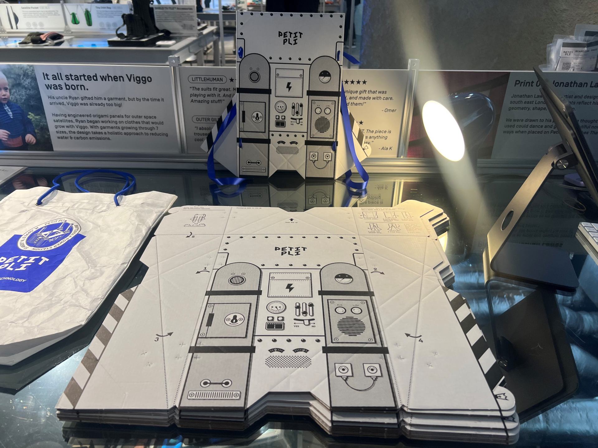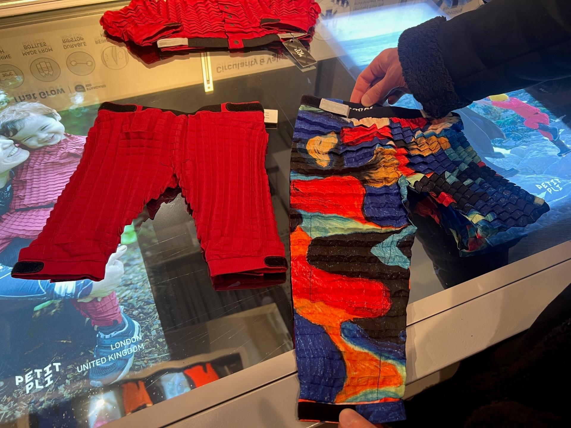 散策中に見つけたこちらのお店は、バタシ―発電所が初めての路面店である「Petit Pli(プチ・プリ)」という新進気鋭のイギリスのファッション素材ブランドです。2017年に宇宙エンジニアのYasin氏がスタートしたプチ・プリのコンセプトは「成長と共に育つ服」。どういうこと?と思いますよね。実は秘密は人工衛星で使用されている折り紙の技術「ミウラ折り」の技術を洋服に応用した素材なのです。人工衛星は限られたスペースに太陽光パネルを収納して必要な時に展開する必要があります。プチ・プリの創業者は、40%の衣料品がサイズが合わないために返却されて殆どが廃棄されたり、子供服が成長につれてすぐに着られなくなってしまうというファッション業界が抱える構造的な問題に取り組むべく、この折り紙技術を応用したファッション素材を作る会社を設立しました。下の子供用のズボンの写真がわかりやすいですが、赤いズボンと柄のズボン、どちらも完全に同じサイズなのですが、折り紙構造を広げていくと、あら不思議、ズボンの丈が長くなります。ウェストも調整可能になっているので、何とこのズボンは9か月から4歳まで履けるのだそうです。しかもウォーター・プルーフです。素材はリサイクルされたプラスチックで作られており、製造しているポルトガルの工場も100%グリーン・エネルギーを使用しているというから徹底しています。イギリスの若い世代の人はこういったサステイナビリティに関心が高い人が多いです。