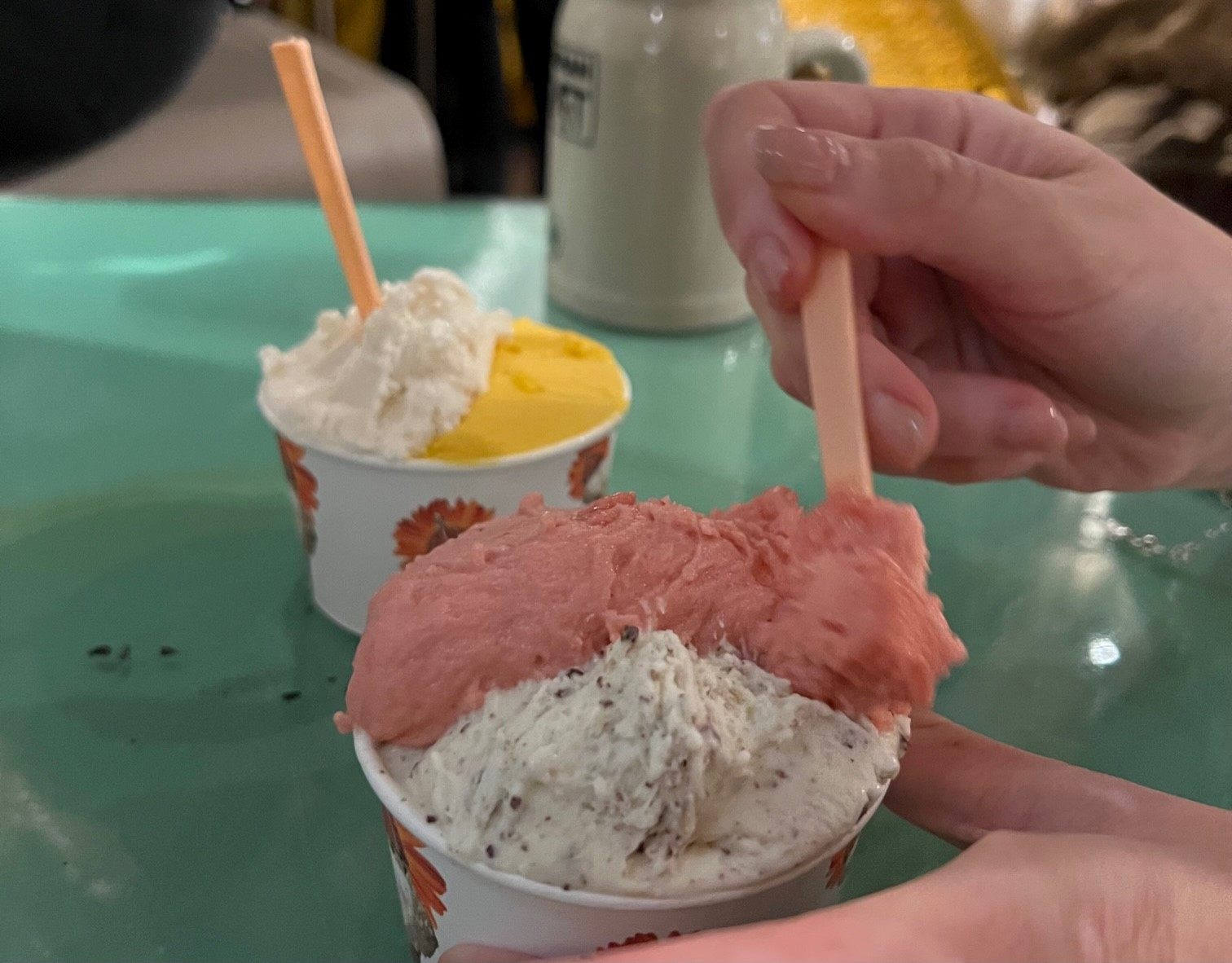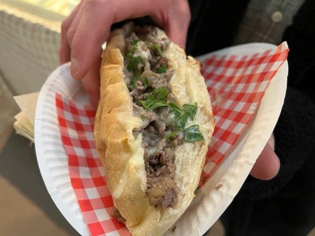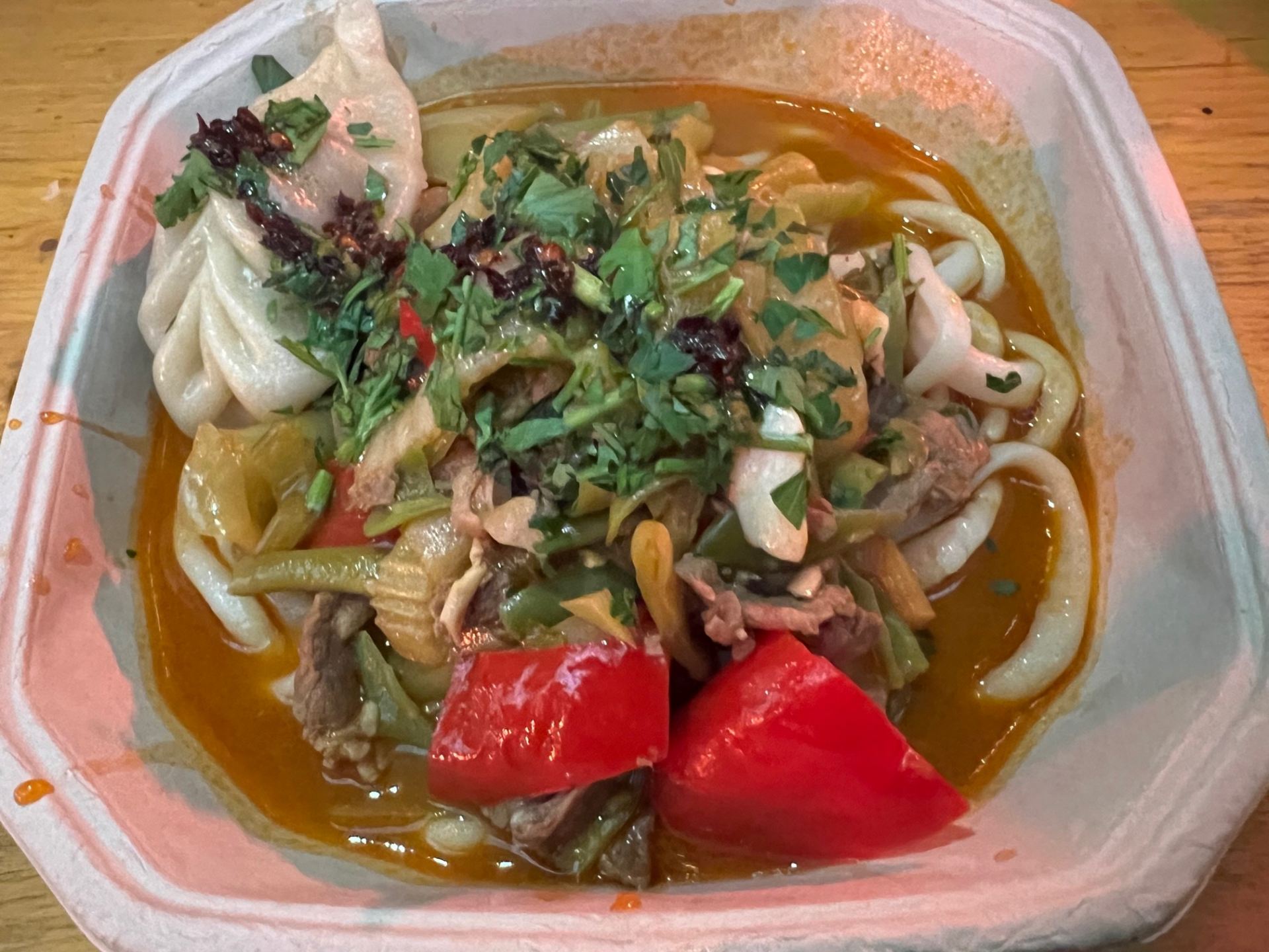 飲み物が決まったところで、今度は食べ物を調達しましょう。この日はフィラデルフィア・チーズ・ステーキサンドとウズベキスタンのラム肉のヌードルをセレクトしました。ステーキサンドの店は、精肉店が運営しており、元々短期契約でメルカートに出店していましたが、人気が出たので最近レギュラーになったようです。とろけるチーズが薄切りのお肉と絡み合ってとても美味しかったです。ウズベキスタンのラム肉のヌードルは、追加のウズベク餃子のトッピングをのせていただきます。ウズベキスタンに行ったことがないので正解がわからないですが、草原の遊牧民!という感じの味でした。(たぶんジンギスカンを思わせるパンチのあるラム肉のせい)ウズベキスタンは行きたい国リストの上位にあるので、いつか答え合わせをしに行ってみたいです。この他にもヒマラヤ餃子やカリビアン料理、モダン・シリア料理など興味深い店舗が多く入っていますので、興味は尽きません。(ピザやハンバーガーなどいわゆる王道の店舗も勿論あります)