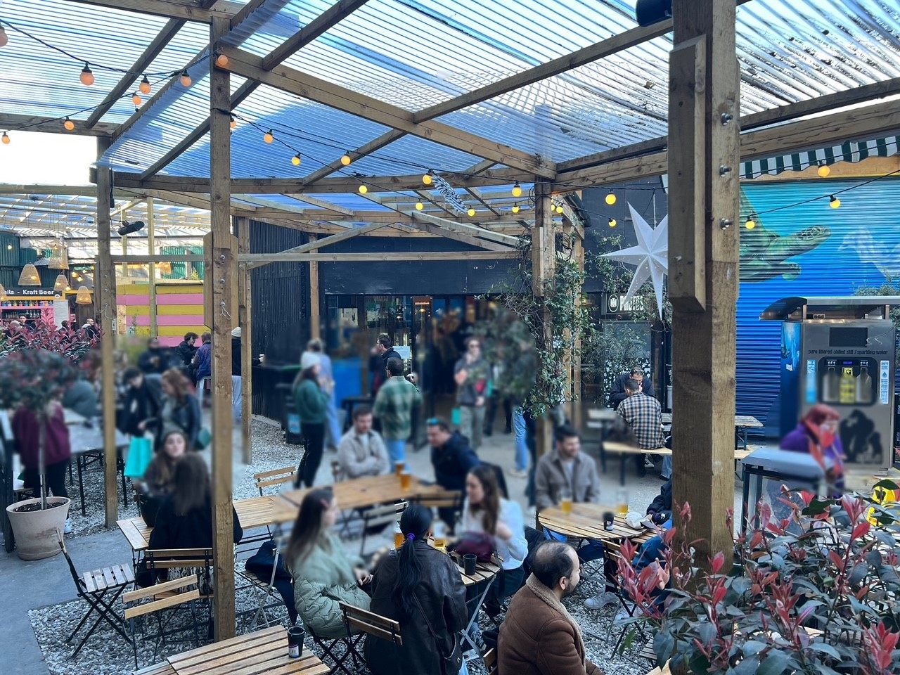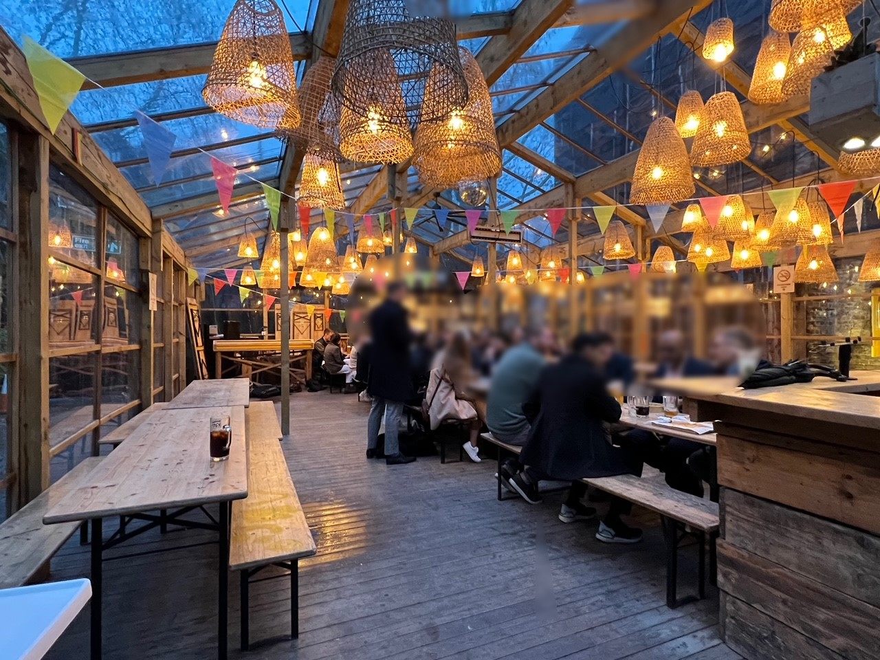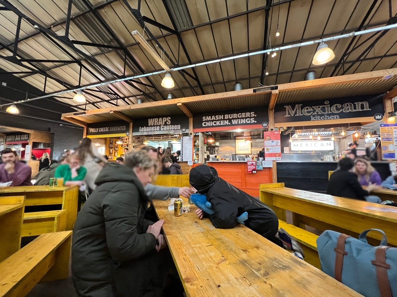 メルカート・メイフェアがスタートしたのは2019年ですが、「Mercato Metoropolitano(メルカート・メトロポリターノ」はエレファント&キャッスルにある最初のメルカートで、2016年から営業しています。放棄されていた製紙工場の跡地を利用しており、メイフェアの教会に比べるとかなり広く40店舗以上のお店が入っているので、食事のオプションが多いです。ロンドンに住んでいないとエレファント&キャッスル駅は聞き覚えがないと思いますが、ロンドン・アイがあるウォータールー駅の近くです。とはいえ、メイフェアと違って繁華街のど真ん中にあるわけではないので、利用者はローカルが多めです。平日夜にはスーツの人もちらほら見かけます。