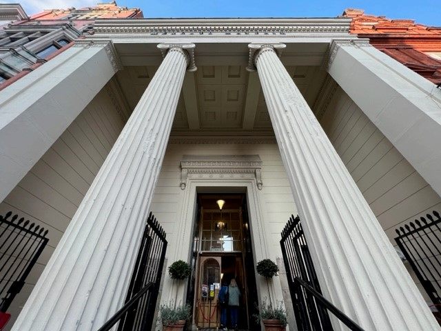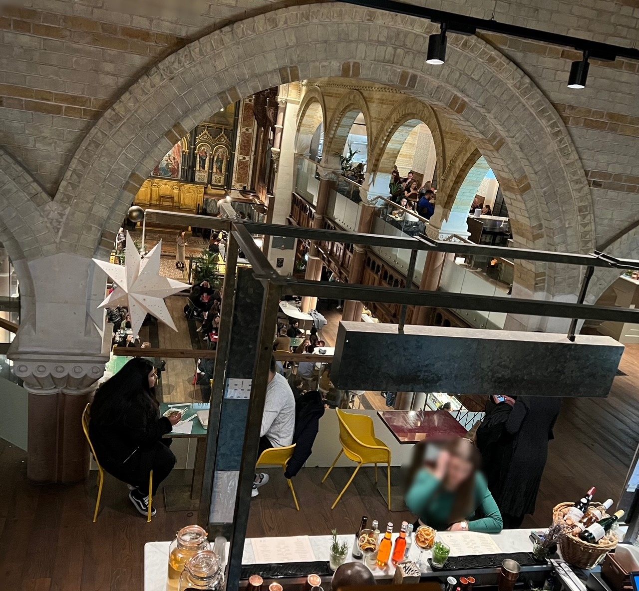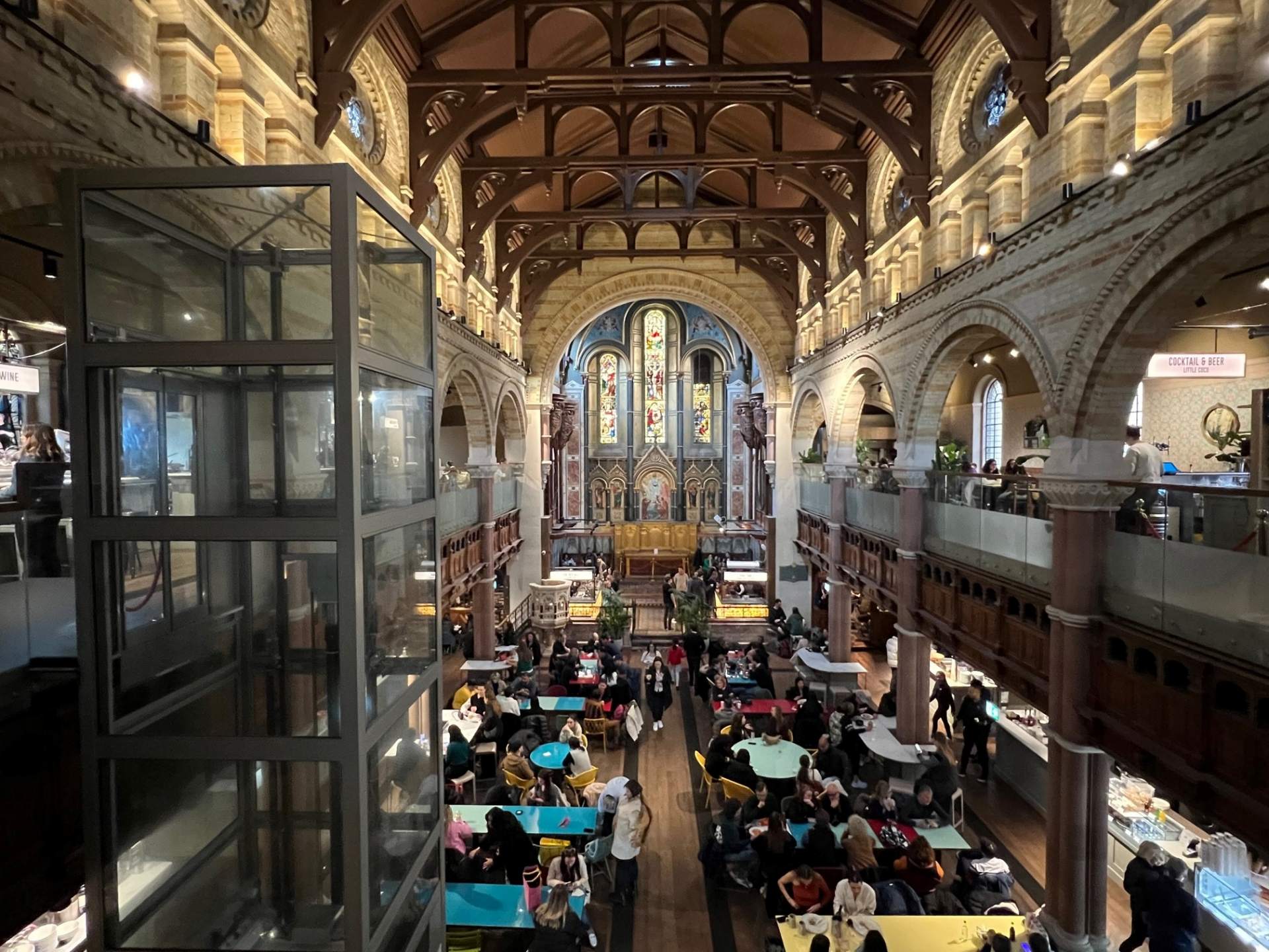 イギリスの宗教に対する寛容ぶりに感心するのがこちら「Mercato Mayfair(メルカート・メイフェア)」。ボンド・ストリートにほど近い、超高級エリアであるメイフェアの美しい教会の中に…フード・マーケットです。入口の優美な柱を見る限り、全くフード・マーケットには見えません。この教会は1820年代に建てられたセント・マーク教会。最高ランクGrade 1の重要建築物ですが、1970年代にその教会としての役目を終え、1973年に世俗化されました。その後、500万ポンド(8億3,434万円)かけて修繕され、2019年からメルカートに生まれ変わったのです。世俗化されたとはいえ、祭壇の装飾やステンドグラス、美しい床のタイルはキリスト教会の頃のまま残されています。そして祭壇の聖歌隊席あたりにドイツのクラフトビールのバーが。そして会衆席の代わりに沢山のテーブルが並べられています。その周囲を取り囲むようにピザやパッタイ、ポケ丼をはじめ15の食事・ドリンク店が入っています。今回は金曜日だったので本格ナポリタン・ピザとドラフトビールで乾杯しました。元・教会ということで天井が高いので空間が広々としていて気持ちがいいですし、石造りの強固な建物なので冬でも暖かいのが素晴らしいです。別の友人がマレーシア・ストリートフードのお店を薦めてくれたので次回はそちらをトライしてみたいです。ルーフトップもあって、外の空気が恋しくなったらテラスで飲むのも気分が変わって楽しいですね。ちなみに、クリプト(地下聖堂)にはワインバーが入っています。地下ですが、とても綺麗に整備されているので、ジメジメしていたり不気味だったりはしません。美しいワインセラーがあるのですが、確かにワインセラーは温度・湿度管理のために地下にあることも多いので、理にかなっていますね。教会を建てた人が現在の姿を見たらびっくりするでしょうね。