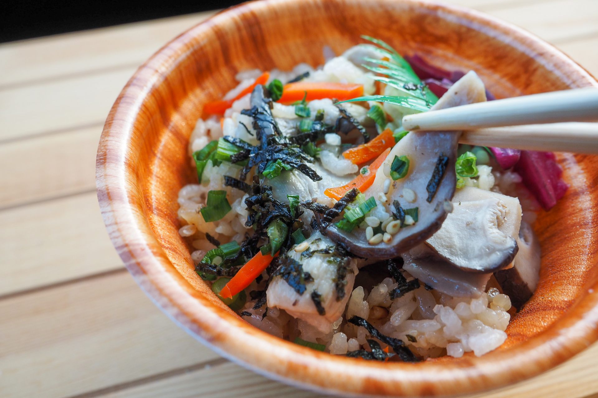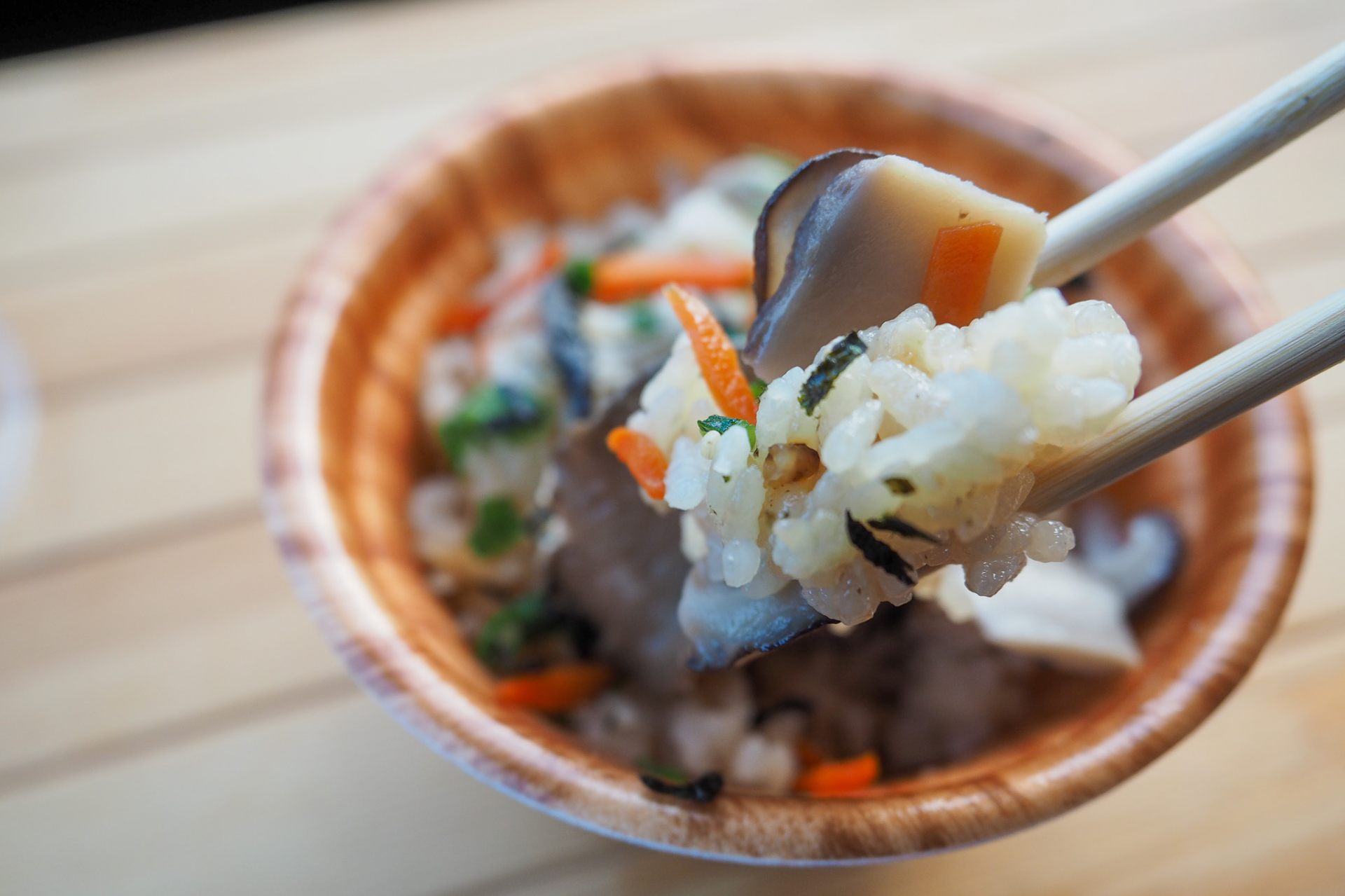 七飯町で栽培されているブランドしいたけ「王様しいたけ」の出汁を使って、七飯町産米を炊いた炊き込みご飯は、しょゆベースで王様のしいたけもたっぷり入っています。
