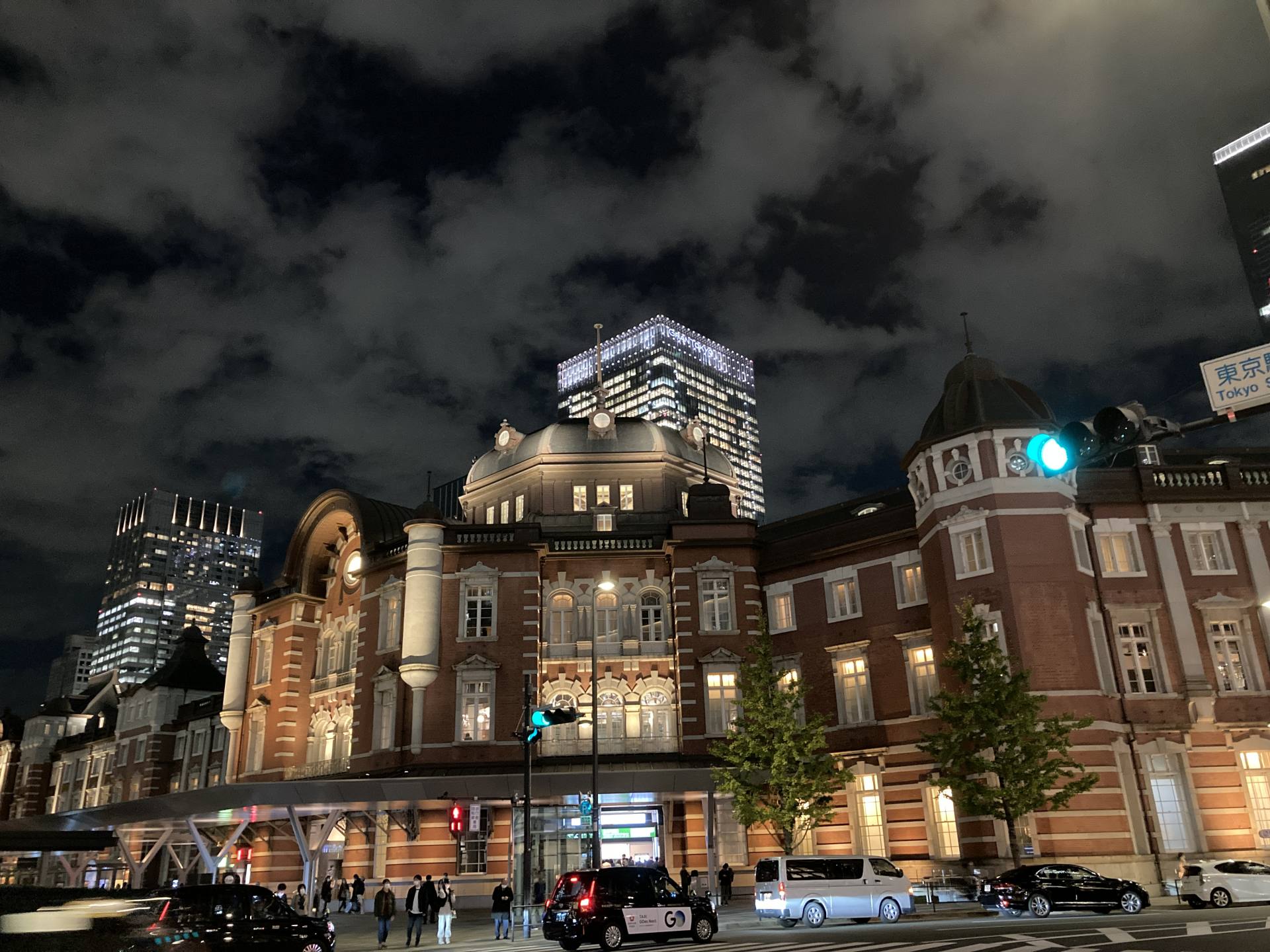 ライトアップされた東京駅丸の内駅舎を一望し、流れる光線のようにプラットフォームを出入りするJR線列車を眺めていると、時間の感覚を忘れそう。