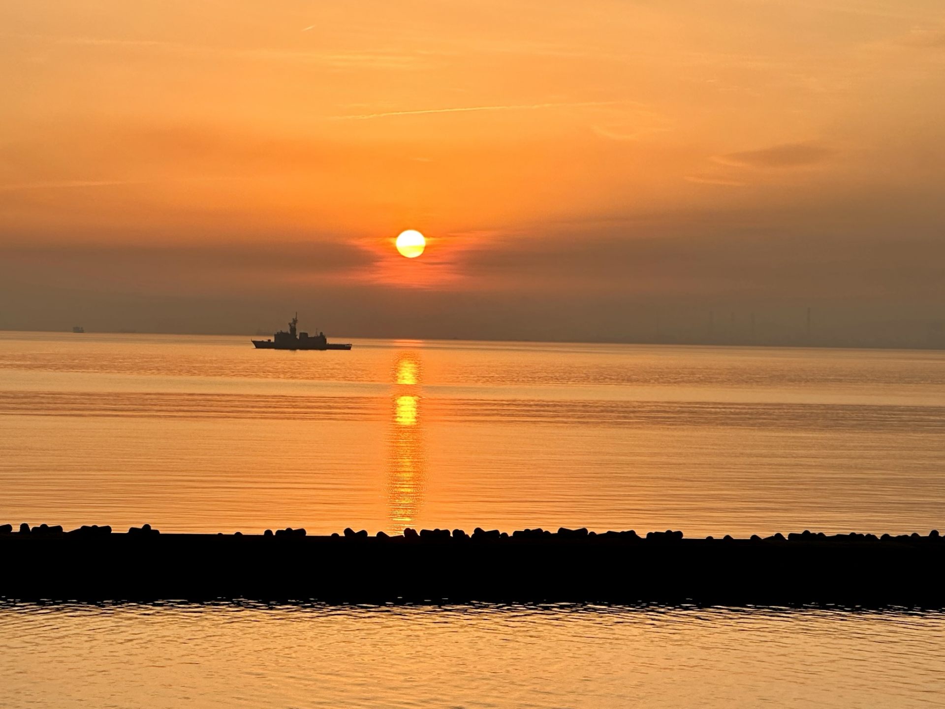 そろそろ別府湾に入港です。日の出と共に現れたのは、海上自衛隊の艦艇です。普段海を見る所に住んでいない筆者は、昼夜問わず国防してくれてる国防の艦艇に出会えて、感動も頂きました。