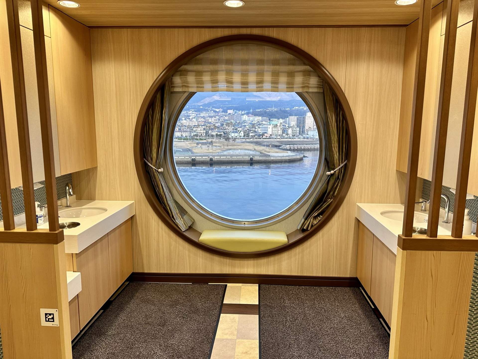 可愛い丸窓、旅情をそそります。丸窓から別府の街が見えてきました。