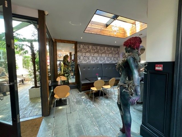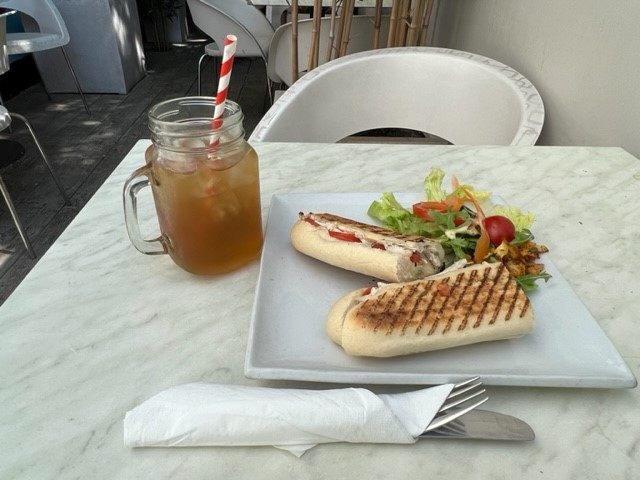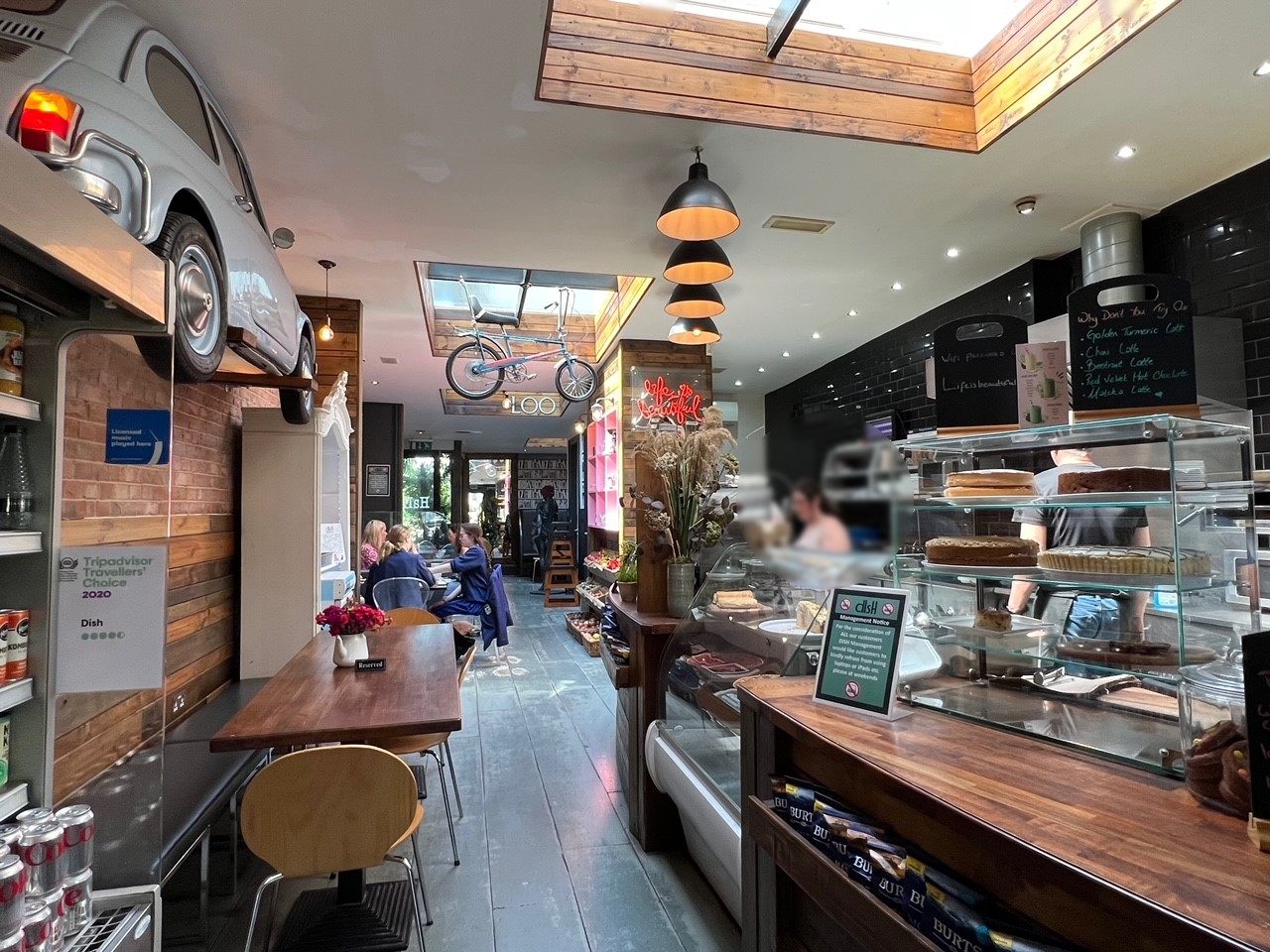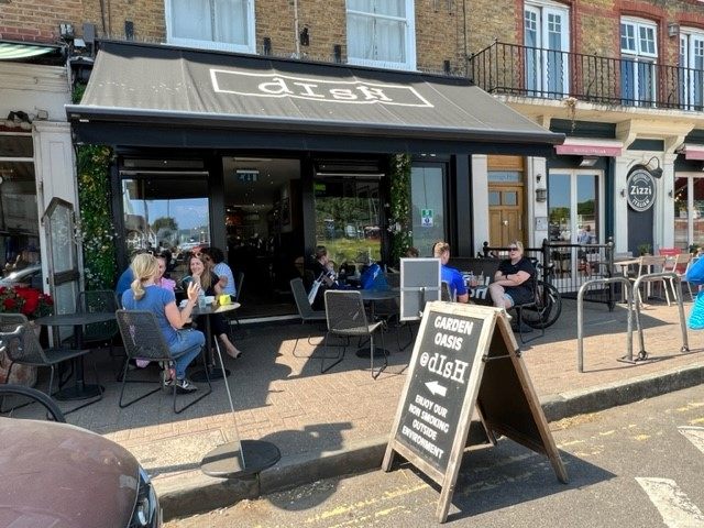 ハンプトン・コート駅に到着すると、ついつい橋を渡ってハンプトン・コート宮殿に直行してしまいがちなのですが、川の手前にはハンプトン・コート・ビレッジがあります。ローカルな雰囲気のビレッジには味のあるカフェやアンティーク・ショップがあり、散策せずに帰るのは少々もったいないのです。まず紹介するのは地元の方にお勧めいただいた「Dish(ディッシュ)」というカフェ。駅の向かい側にある独立系のカフェで、毎日朝の6時からオープンしているので自転車のお客さんにも人気があるそうです。店は細長いのですが、店頭にはテラス席のテーブルが、奥にもガーデン席があるので意外とテーブル数が多いです。フードのメニューは、朝食、ブランチ、パニーニ、サンドイッチ、ジャック・ポテトにサラダなど。筆者はガーデン席で冷たいピーチ・ティーを頂きましたが暑い日なので最高でした。ハンプトン・コート宮殿観光の前後の休息や軽食におすすめのカフェです。
