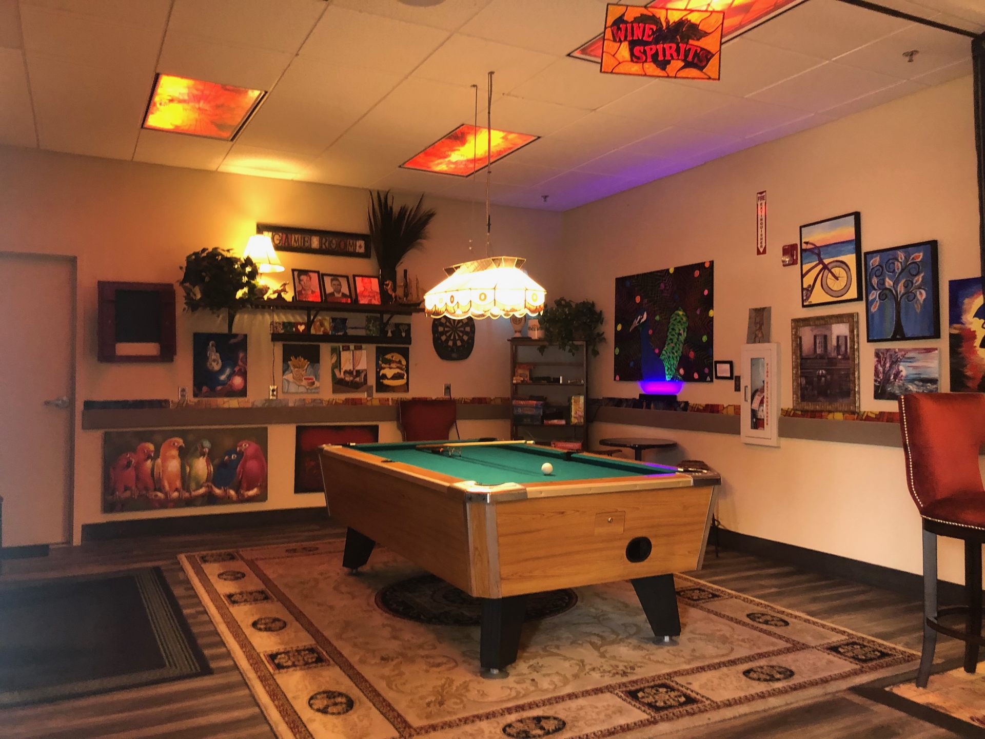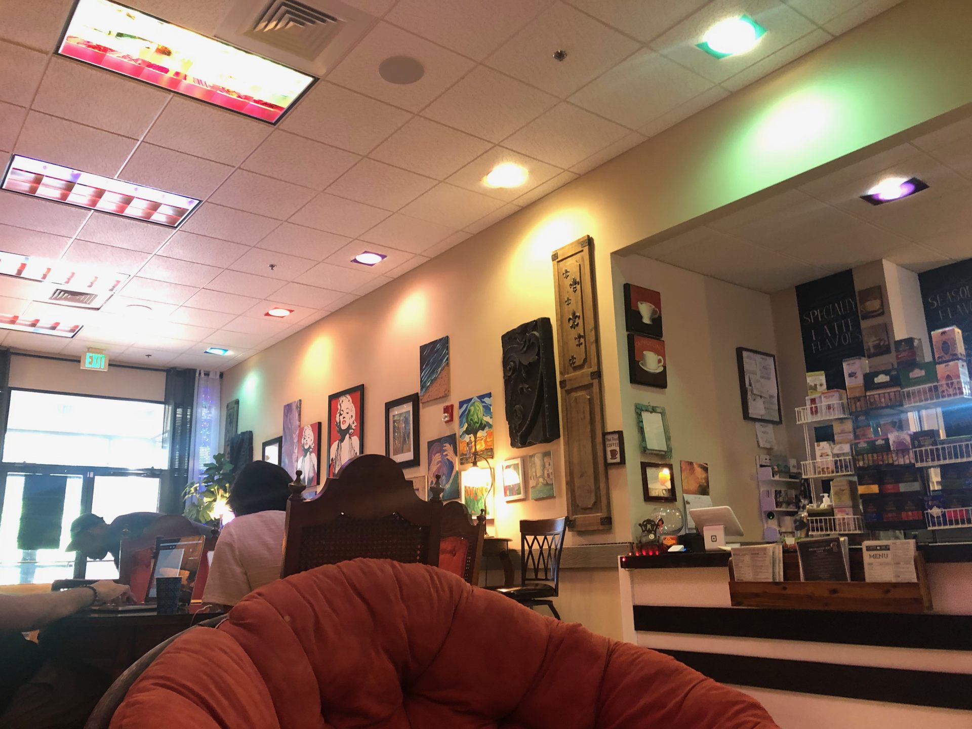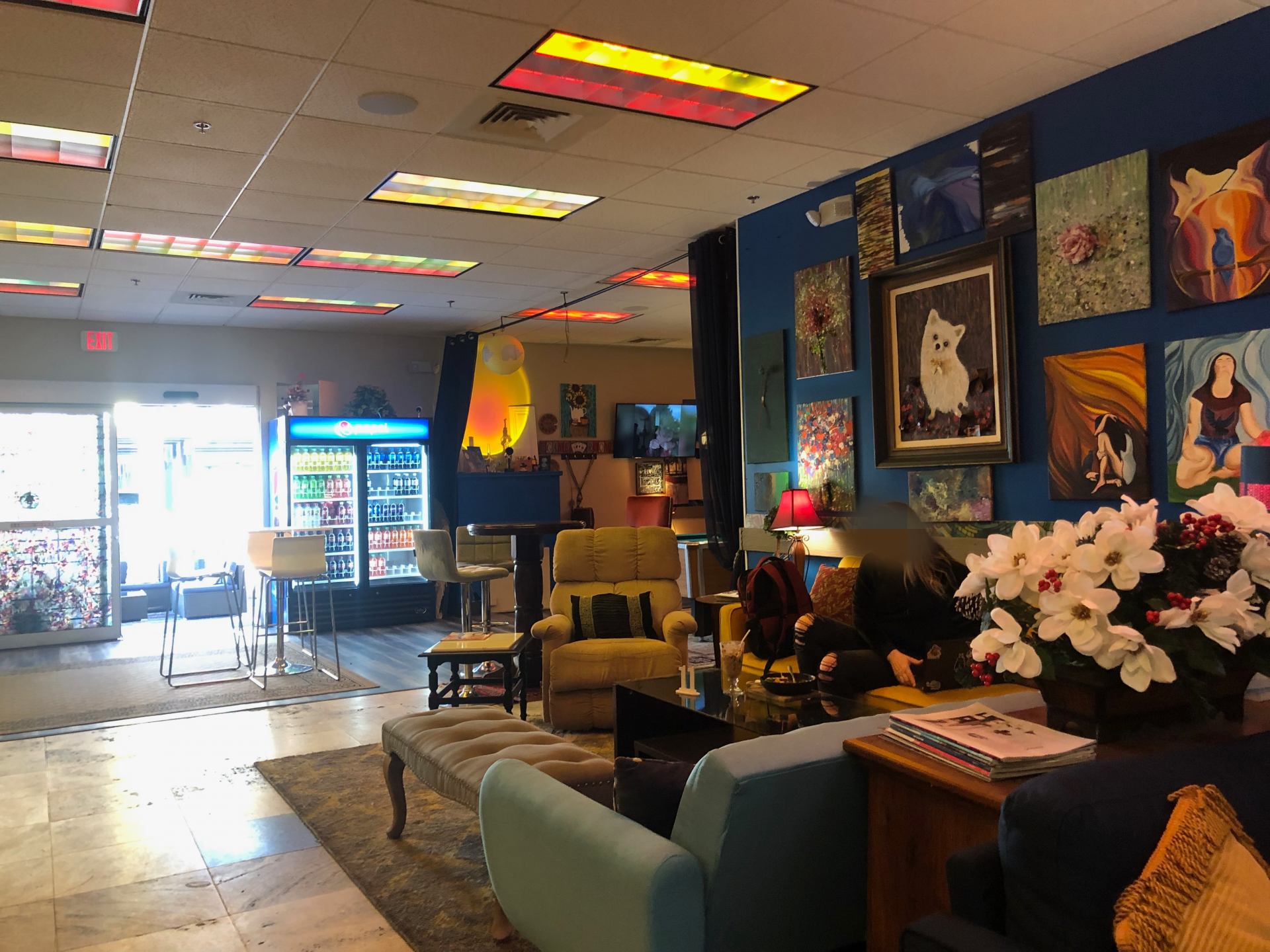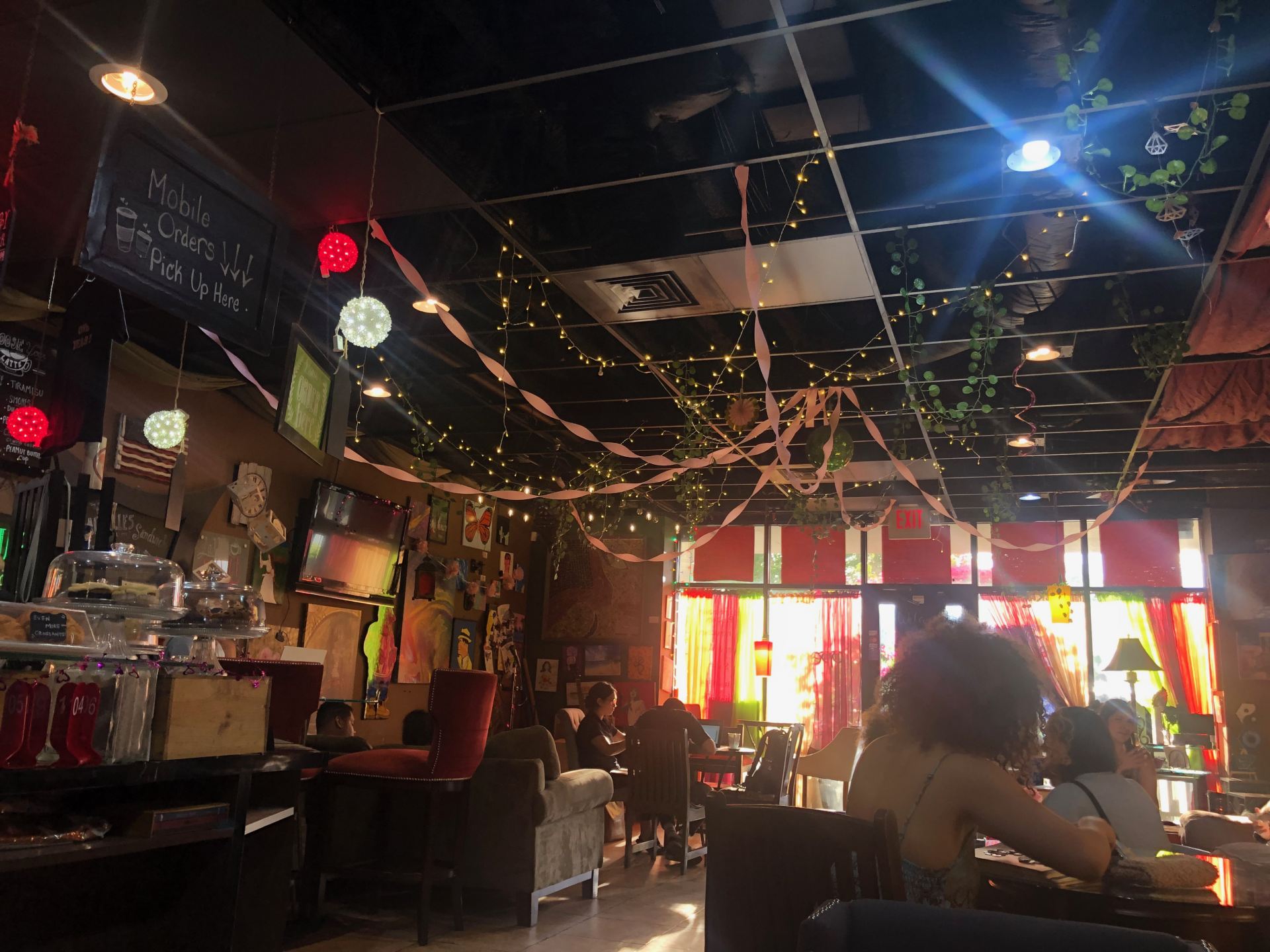 壁に絵が飾ってあったりカラフルなデコレーションがしていたり、ちょっと薄暗くてソファーや形の違うテーブルや椅子がある隠れ家的な雰囲気のアートカフェ。