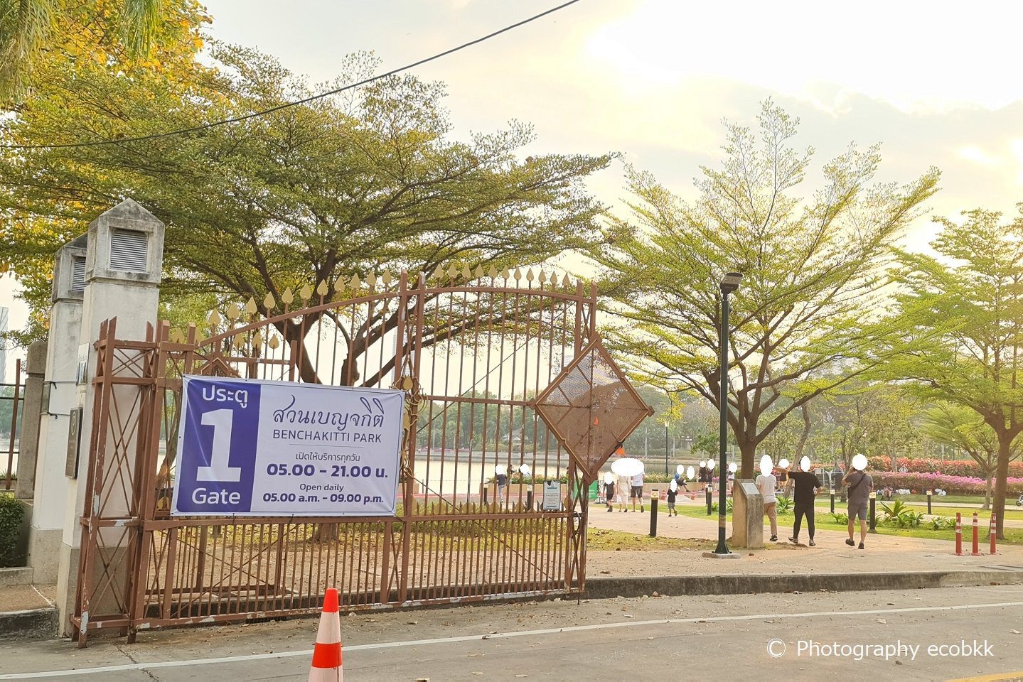 まずはじめに、ベンジャキティ公園の名称について少し言及したいと思います。ラチャダピセーク通り側のベンジャキティ公園(ベンチャキティ公園)の入口(1番出口)近くには、少し文字が見えづらくなってきていますが、英語で「Benjakitti park」と記載された茶色い看板があります。ところが、最近、同入口の門に、大きく「Benchakitti park」と書かれた旗があります。どうやら、英語表記は、jがchが用いられる傾向が強まったことがうかがえます。