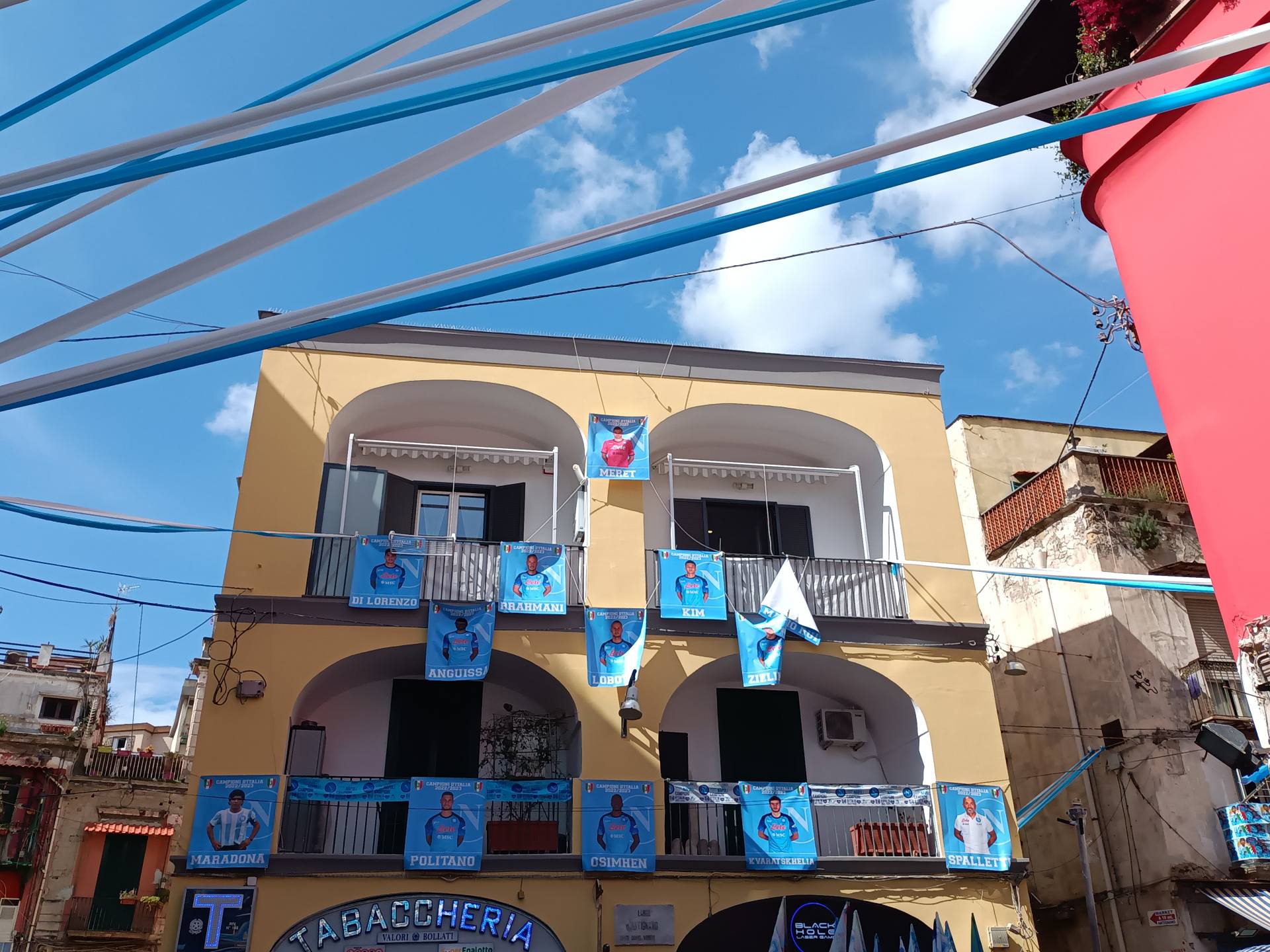 悲願の優勝になるかとナポリファンたちはまだ決まっていないのに、すでに町並みは優勝の念願旗を飾っています!