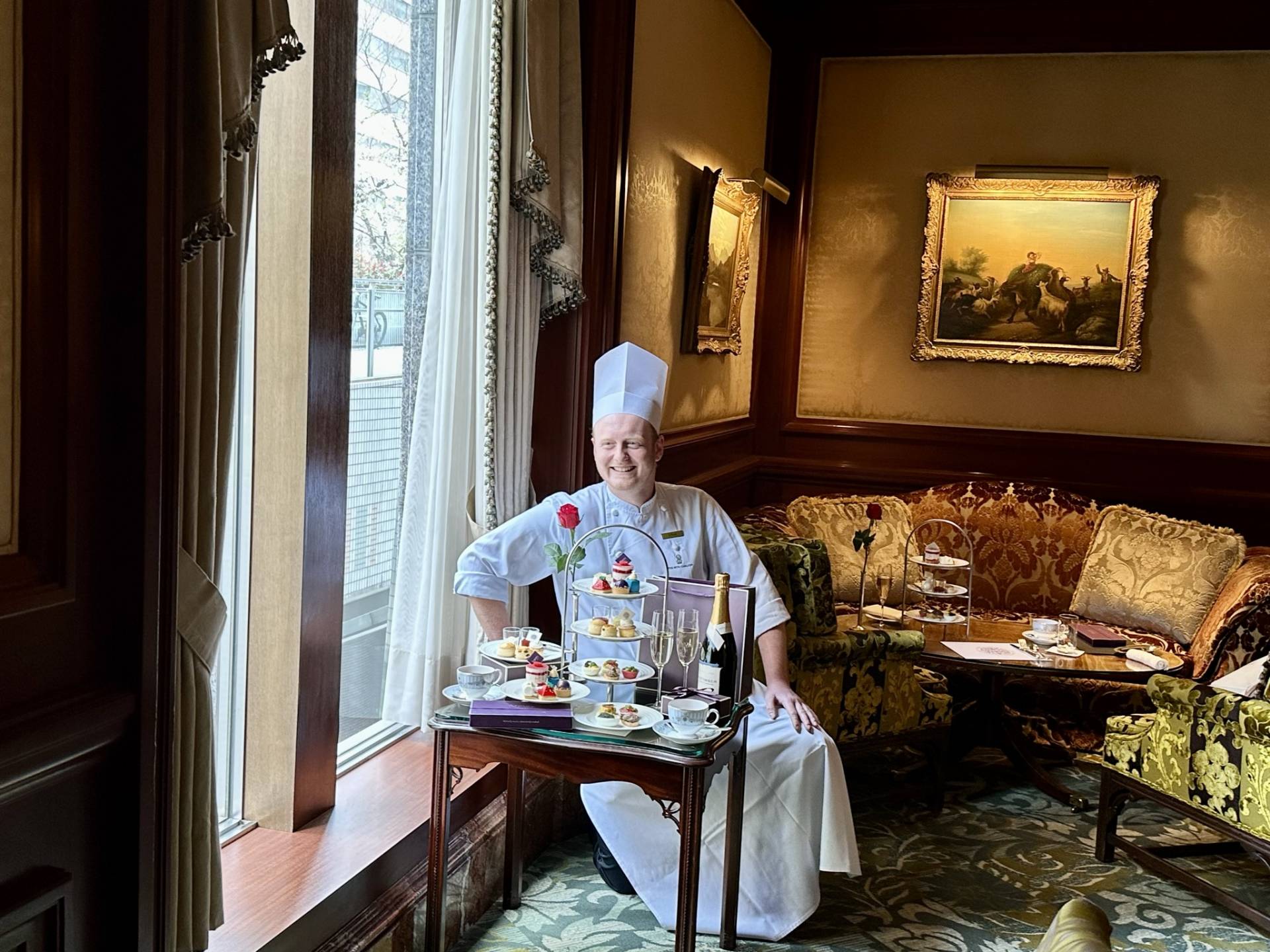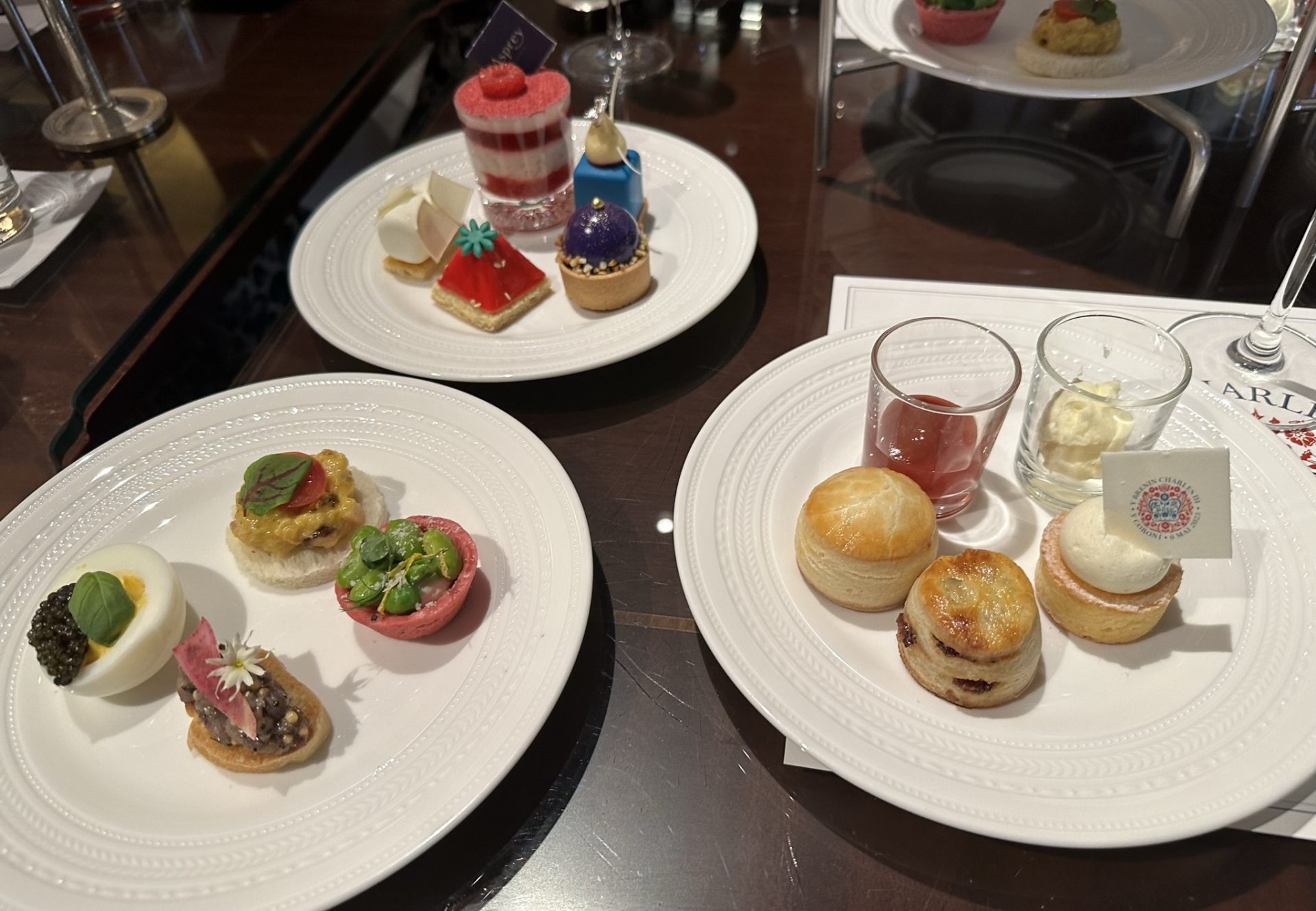 アスプレイとのコラボレーションアフタヌーンティーは、総料理長 アンドリュー・リザランド氏と、英国ご出身 ペストリーシェフ エリオット・スタデン氏が腕を振るいます。英国国王戴冠式をイメージしたスイーツ、セイヴォリー・スコーンが並びます。