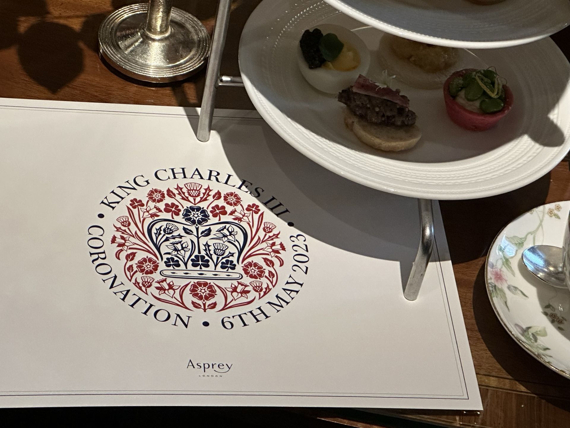 期間中は、この歴史的なイベントに合わせ、公式の戴冠式エンブレムがマットはじめアフタヌーンティーで使われます。デザインは、チャールズ国王の地球や自然への愛情と関心にインスパイアされたものだそうです。