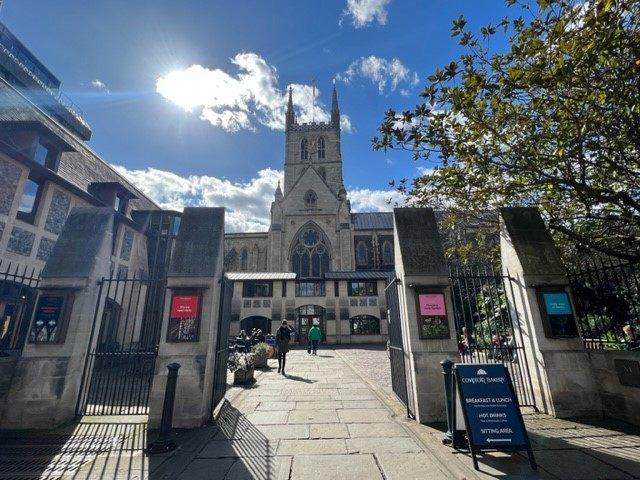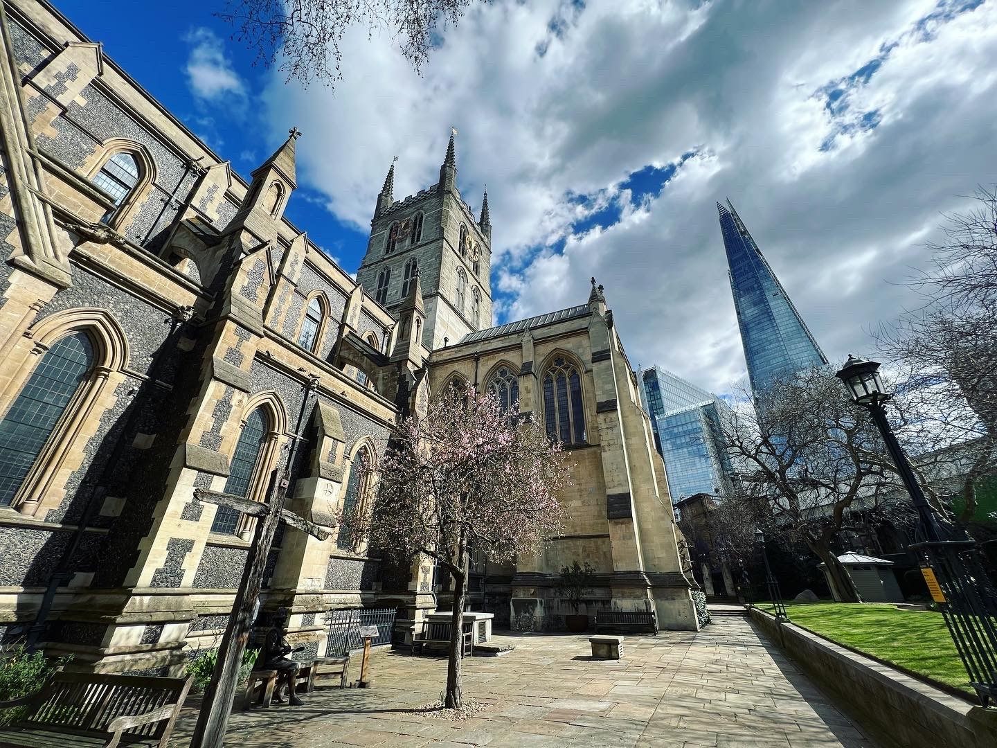 ここSouthwark Cathedral (サザーク大聖堂)はバラ・マーケットの裏にある教会で、入場は無料です。喧騒のバラ・マーケットから大聖堂に入ると、静寂な空間にほっと一息。サザーク大聖堂はイギリス国教会の聖堂です。訪問者歓迎のオープンな雰囲気なのですが、実はこの場所は古くは606年ごろから教会が立っており、由緒あるロンドン最古の教会なのです。キリスト教が広がる以前もローマ人の信仰の場所だったとか。現在の建物は13-15世紀のゴシック建築で、シェイクスピアがグローブ座の近くに住んでいた頃(17世紀初頭)に、この教会に所属していたので、シェイクスピアにちなむものがいくつかあります。彼の兄弟のエドマンド・シェイクスピアもこの教会に埋葬されました。