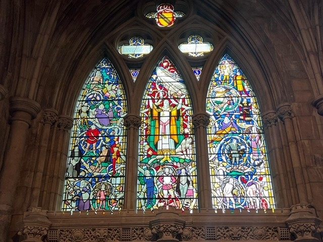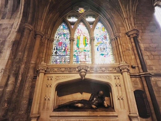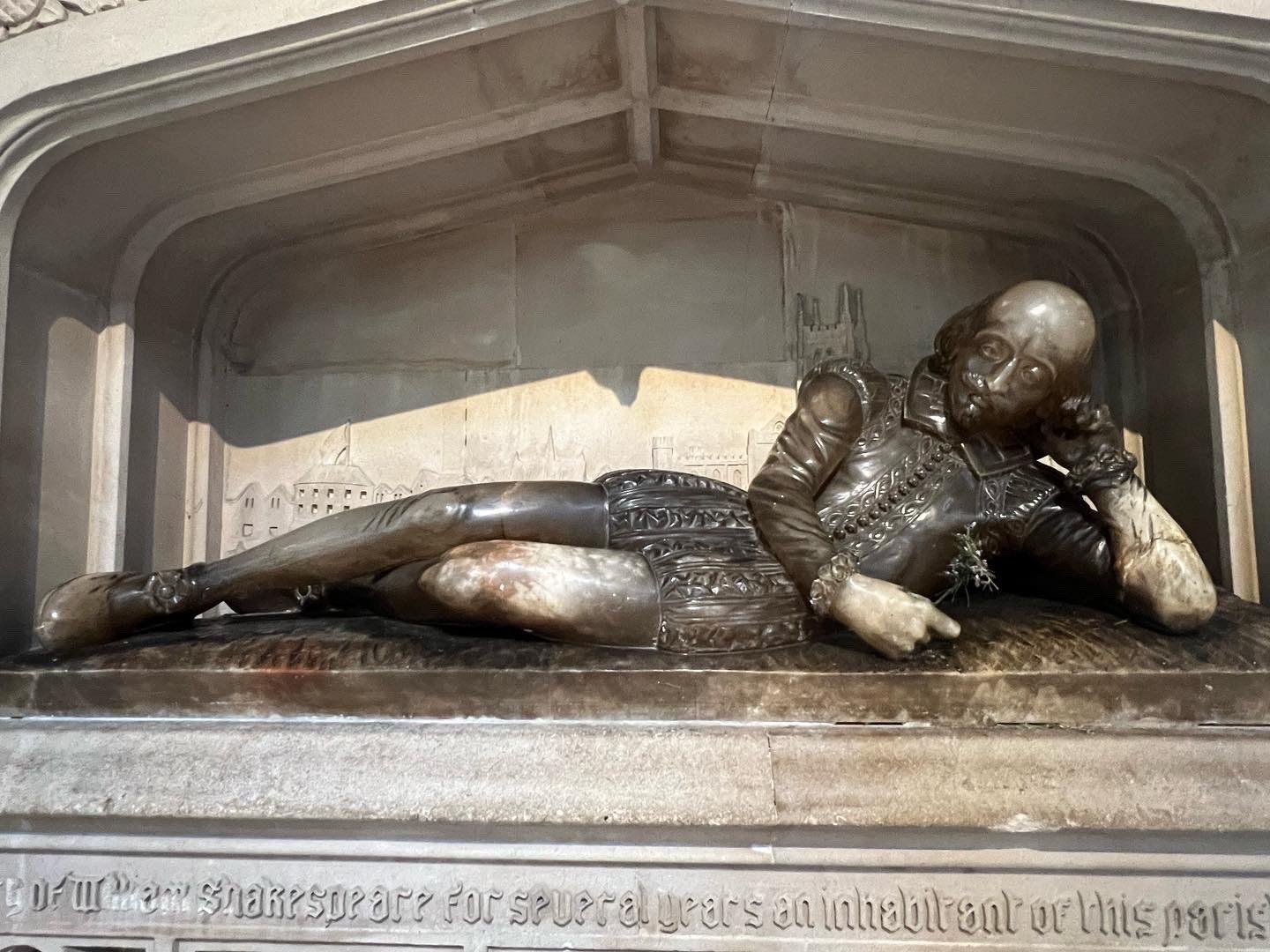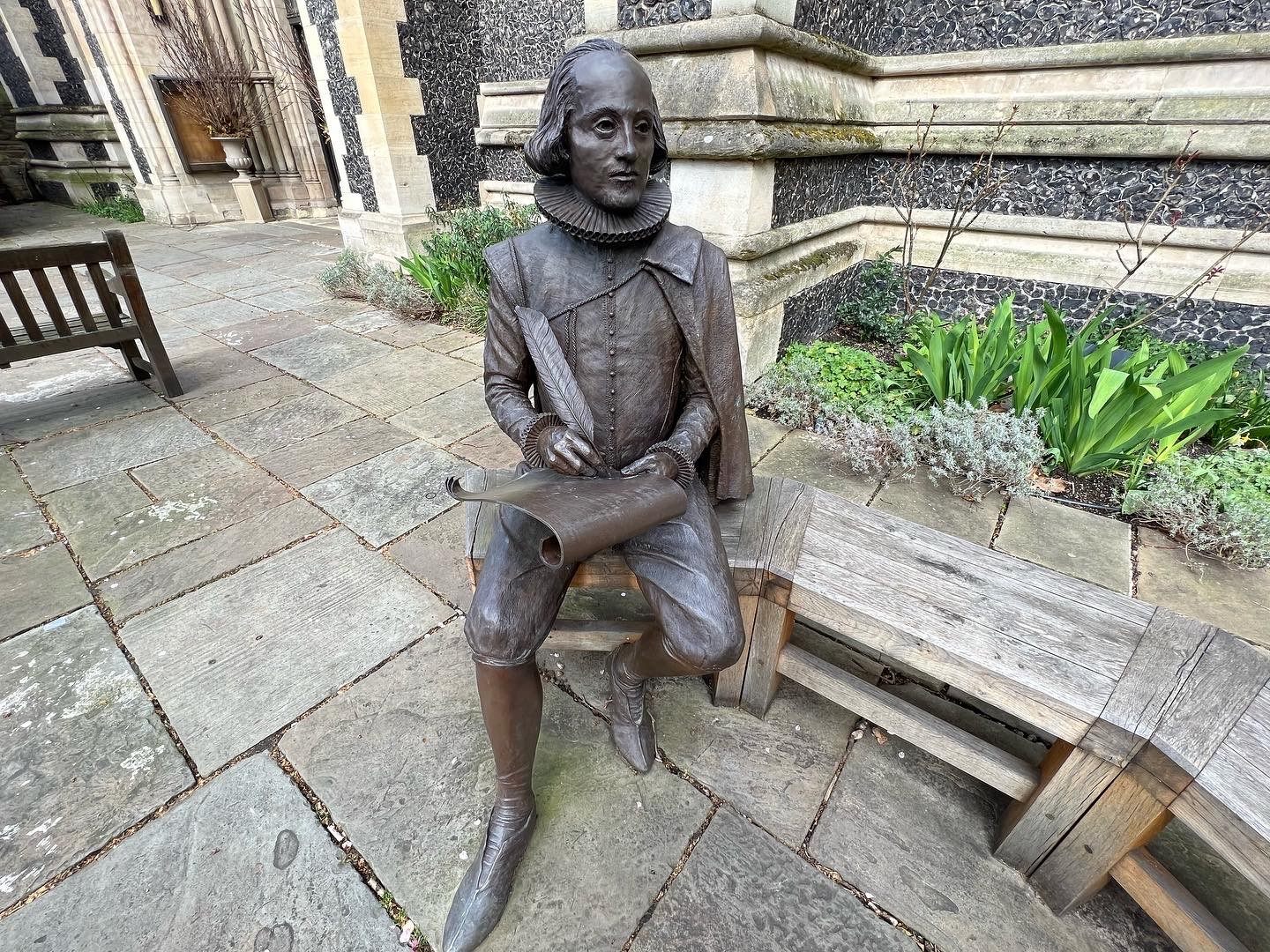 何と言っても見どころはシェイクスピアのメモリアル・ウィンドウです。このステンドグラスは1954年に戦争によって破壊された窓を取り換える際に行われたコンペで選ばれたクリストファー・ウェブよって製作されました。左側にシェイクスピアの喜劇、中央にシェイクスピアの代表作テンペスト、右側に悲劇のキャラクターたちを配しています。リア王やマクベス夫人はどこかな、と自分の知っている作品のキャラクターを探すのも楽しいですよ。ステンドグラスの下には寝そべったシェイクスピアの像があります。筆者には意気消沈したような表情に見えましたが、同行者は「空想の翼を広げているところ」との意見でした。中庭にも別のシェイクスピアの像があり、シャードが見下ろす憩いの中庭のベンチで、次の作品の構想を練っています。この中庭は人も少なくリラックスできるので、シェイクスピアの隣に並んでのんびりと彼の著作を読むのもいいかもしれませんね。