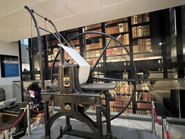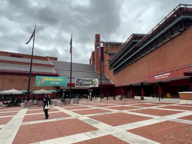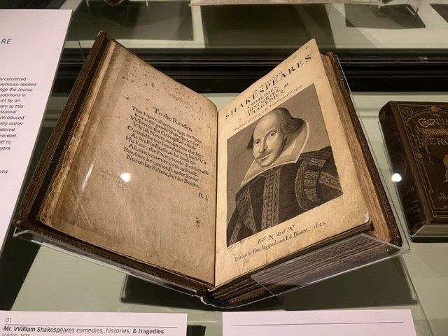 次にご紹介するのは、ロンドン・ブリッジ地区から少し離れて、セント・パンクラス駅のすぐ隣にある「British Library(大英図書館)」です。ここにはシェイクスピアの「First Folio (ファースト・フォリオ)」があるのです。ファースト・フォリオというのは彼の死から7年後の1623年に出版された、シェイクスピアの戯曲のうち36本をまとめた最初のコレクションの初版本です。何が歴史的に重要かというと、36本のうち17本は1623年までに何らかの形で印刷されていましたが、残りは全く印刷されていなかったので、もしもこのファースト・フォリオがなければ、「ジュアリアス・シーザー」や「マクベス」などは永遠に失われ、忘れ去られてしまった可能性があるというところです!この感動をお金に換算すると…約1,000万ドル(10億5,000万円)以上だそうです。(同じファースト・フォリオが米国で2020年に落札された際の値段)現在も完全な形で残っているのは世界でわずかに56部だそうです。その貴重な一冊が目の前で拝めるというわけです。