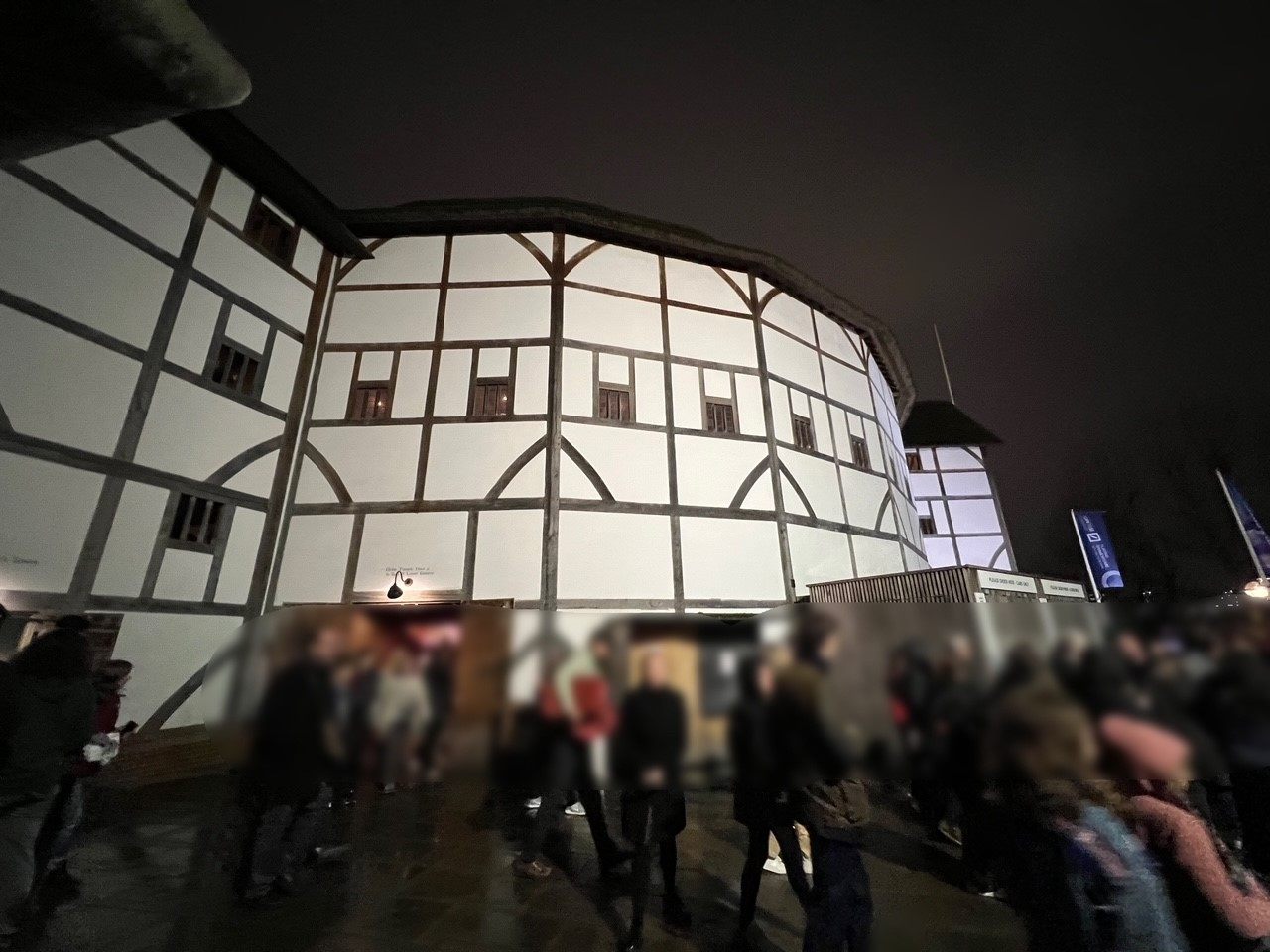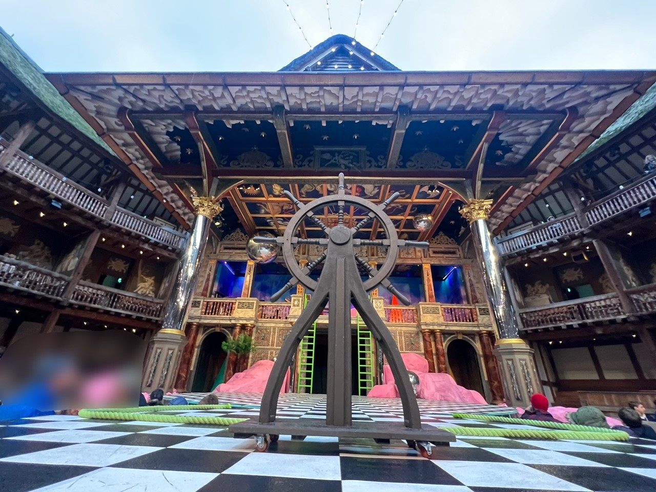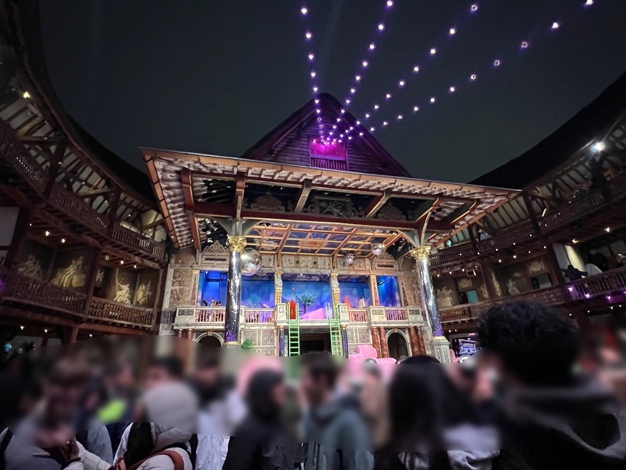 そんなグローブ座、ウォーキングツアーもいいですが、劇場なのでできれば演劇を味わってみてほしいです。実はグローブ座の立見席は5ポンドで購入することができます。90分間立ち見で、且つ天井が開いているので雨が降ると大変ですが、本当に手をつなげるような距離で役者さんの歌やダンス、迫真の演技が見られるので、体力に自信がある方にはとてもおすすめです。ものすごい迫力です!(立ち見ですが十分なスペースがあり、窮屈な感じはしません)筆者は同チケットで「テンペスト」を見ました。テンペストは「嵐」の意味で、シェイクスピアが引退前に書いた最後の単独作品で、ファンタジー調で人も死なない比較的平和なストーリーです。(復讐と赦しがテーマです)今回のテンペストは、セリフまわしは古典そのものなのですが、服装はスーツやスニーカーなど現代的でとてもカラフルでした。配役も興味深く、アロンゾー王役は女優さんが「女王」として演じているのが先進的。そしてフェルディナンド王子役の俳優は南アジア系、プロスぺローの弟のアントニオを演じる俳優は東アジア系、セバスチャンはアフリカ系、ステファノ(こちらも元々は男性の配役ですね)を演じる女優はムスリムのヒジャブを連想させる布を被っており、大団円のダンスはボリウッド風と、現代のロンドンを反映したようなクールな演出が素晴らしかったです。