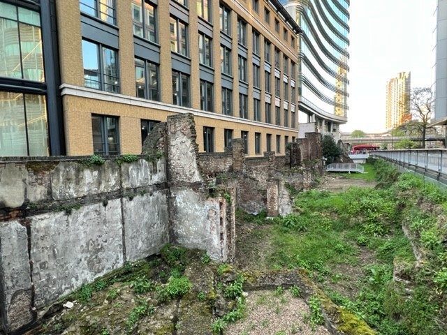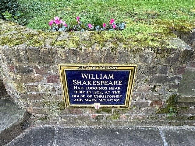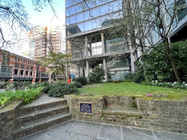 最後のシェイクスピア聖地は、シェイクスピアが1604年に滞在していた場所の近くにある、ブルー・プラーク(ロンドンで有名人にゆかりのある場所を示すパネル)です。この時彼はフランス人でユグノー教徒のマウントジョイ夫妻のもとに滞在していました。この付近は1666年のロンドン大火で大きな被害を受け、付近は様変わりしてしまい、残念ながら夫妻の家やSilver Streetという道すらも失われてしまっています。このパネルの場所がわからなかったらCanaccord Genuityという建物(非常に現代的なビル)を検索すると、その目の前の公園にあるのでわかりやすいと思います。近くには3世紀頃からローマ人が作りはじめたロンドン・シティを囲む防御壁の跡が残っていて、新旧が混ざり合ったロンドンらしい魅力がたっぷりです。しかし、パネルと壁だけだと1分で観光終了してしまうので、せっかくだから歩いて5分の大観光地・セントポール大聖堂を併せてご紹介します。正直に言うと、この大聖堂の建設が開始されたのが1675年、シェイクスピアが没したのが1616年なので、ご近所に住んでいたシェイクスピアですがこの大聖堂を見てはいません。(シェイクスピアが生まれる数年前に旧セントポール大聖堂は落雷とそれに続くロンドン大火で失われているので、シェイクスピアはちょうどセントポール大聖堂の空白の期間を生きた人、ということになります)