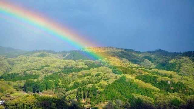 運が良ければ東の空にこんな虹の架け橋が見られるかも知れません。新緑に輝く山並みにかかる虹を見つければ一句ひねってみたくなりますね。